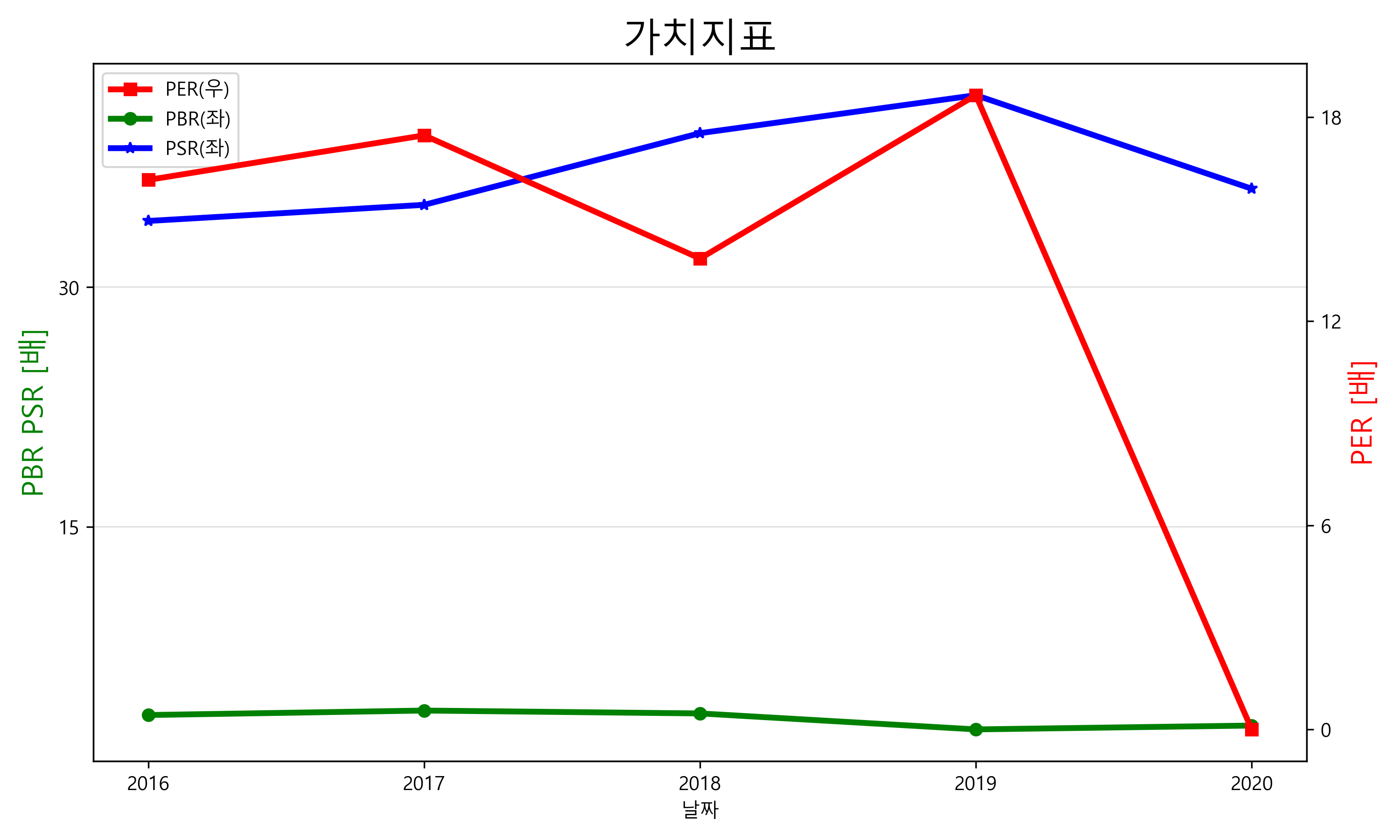 월트 디즈니의 PER, PBR, PSR 그래프입니다.