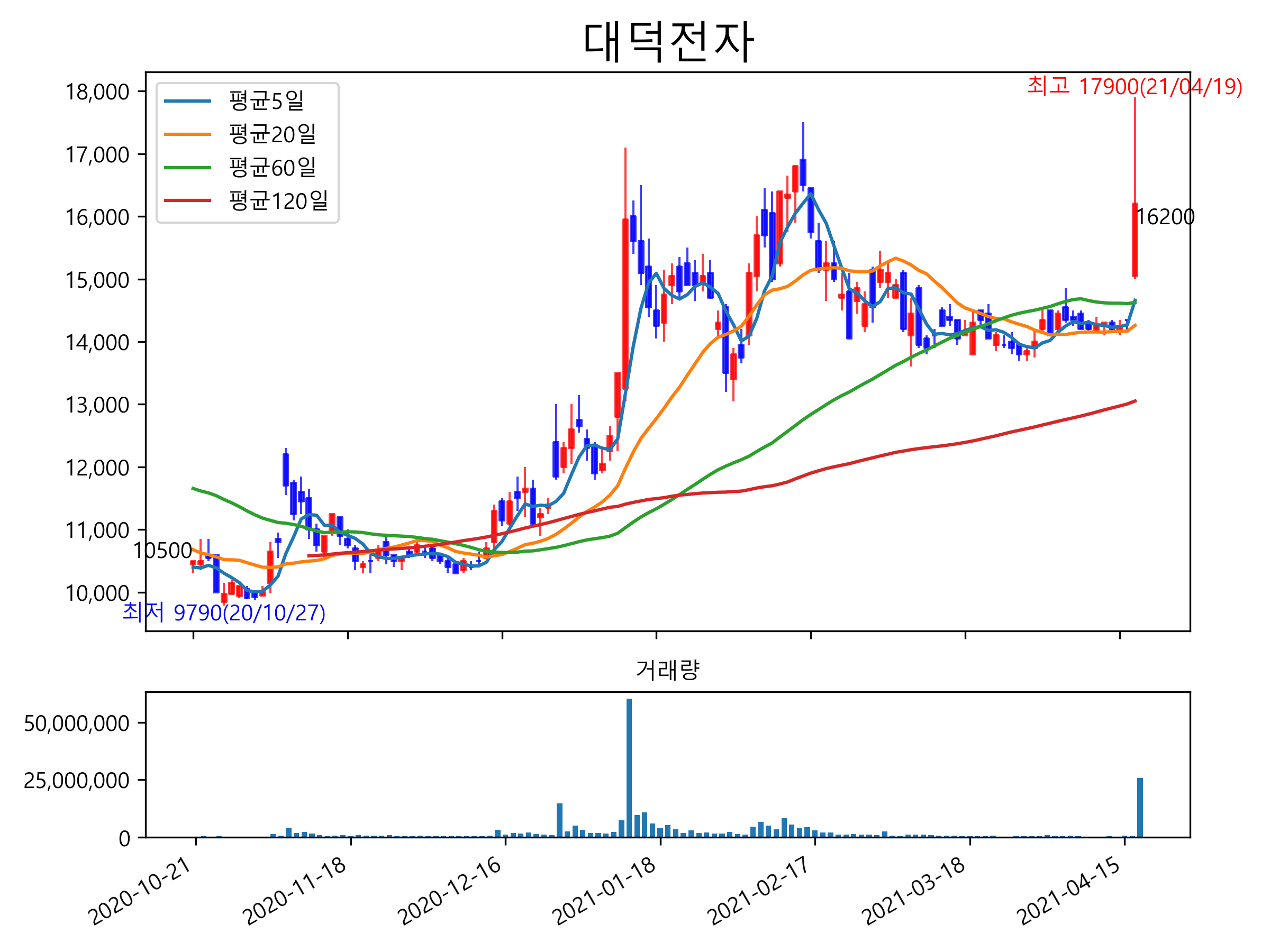 최근 6개월간 캔들차트 및 이동평균선입니다.
