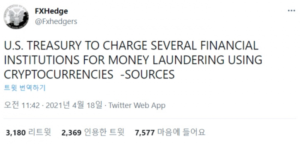 위의 트윗이 그 내용으로 미국 재무부가 암호화폐 시장 돈세탁(Money Laundering)을 조사할 수 있다는 것입니다. 그에 앞서제롬 파월 미국 연방준비제도(Fed) 의장이 '암호화폐는 투기를 위한 수단'이라는 지적도 있었습니다.