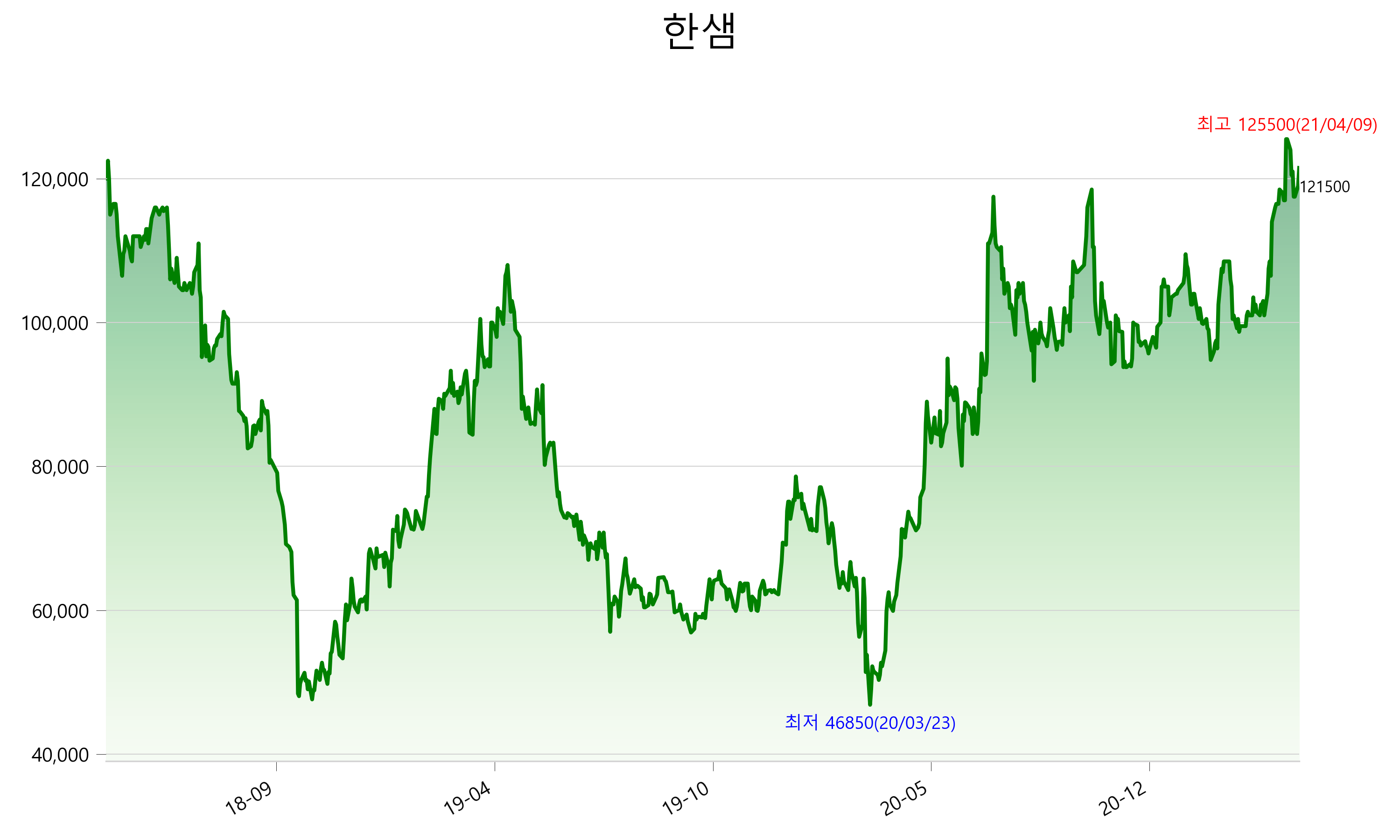 2021년 04월 20일 기준 주가는 121,500원 입니다. 아래는 최근 3년간의 주가흐름입니다.