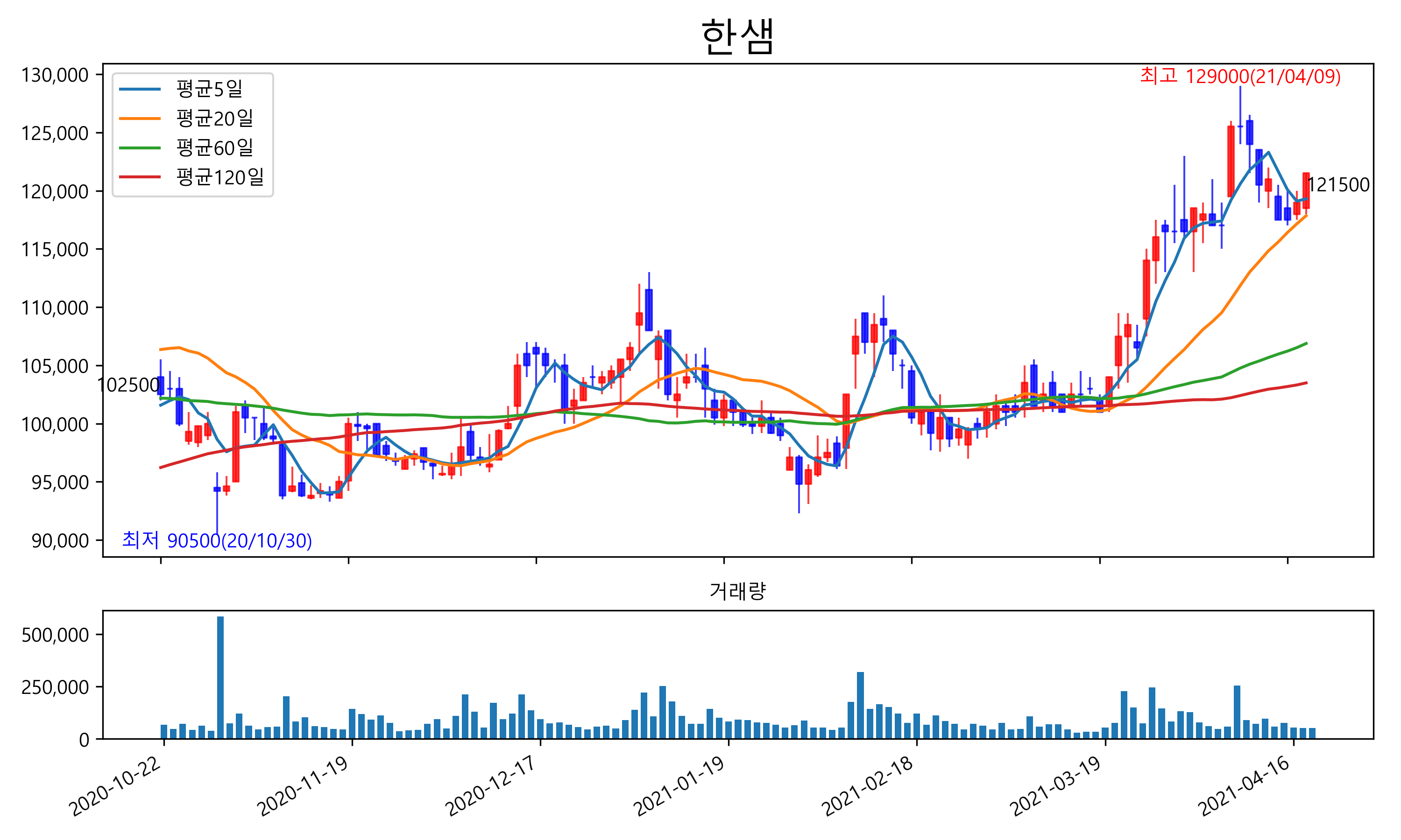 최근 6개월간 캔들차트 및 이동평균선입니다.
