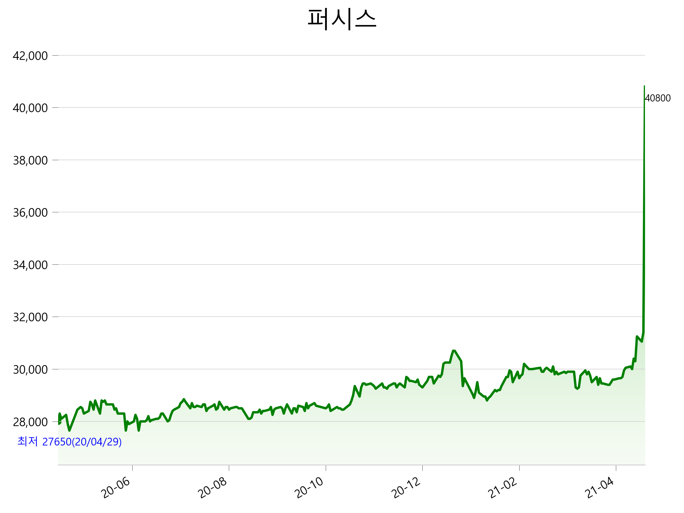 52주 최고가는 40,800원(2021-04-21), 52주 최저가는 27,650원(2020-06-03)으로 52주간 주가 상승률은 45.7% 입니다.