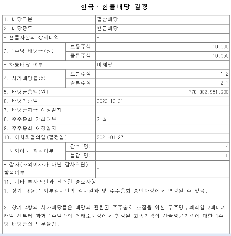 보통주는 10,000원 우선주는 10,050원이 배당되며, 시가배당율은 보통주식은 1.2%, 우선주는 2.7% 입니다. 배당금 총액은 7783억원 입니다.