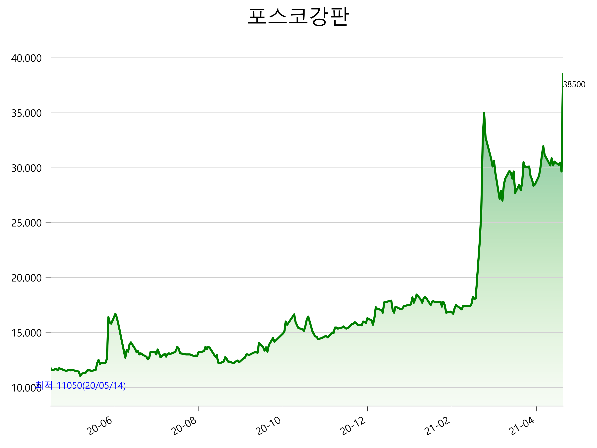 52주 최고가는 38,500원(2021-04-22), 52주 최저가는 11,050원(2020-05-14)으로 52주간 주가 상승률은 227.7% 입니다.