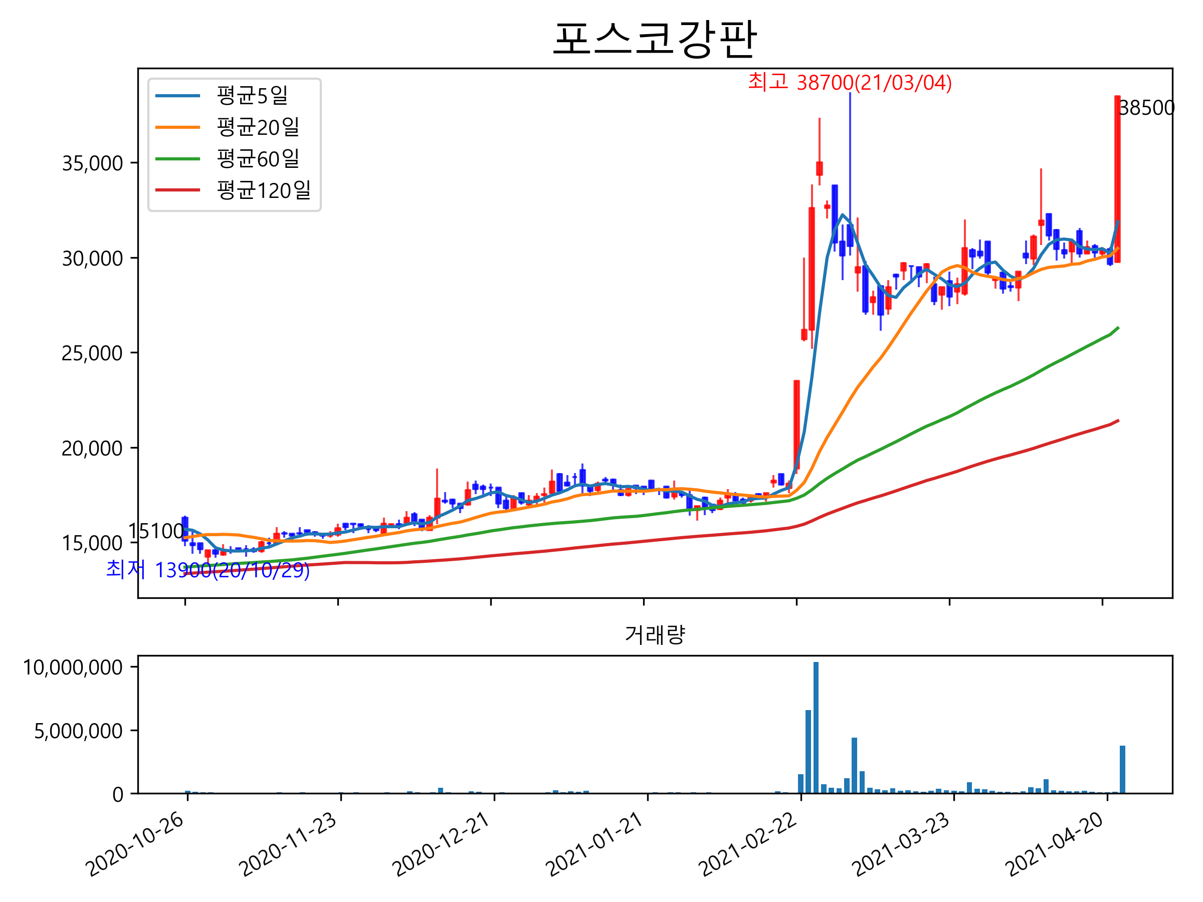 최근 6개월간 캔들차트 및 이동평균선입니다.