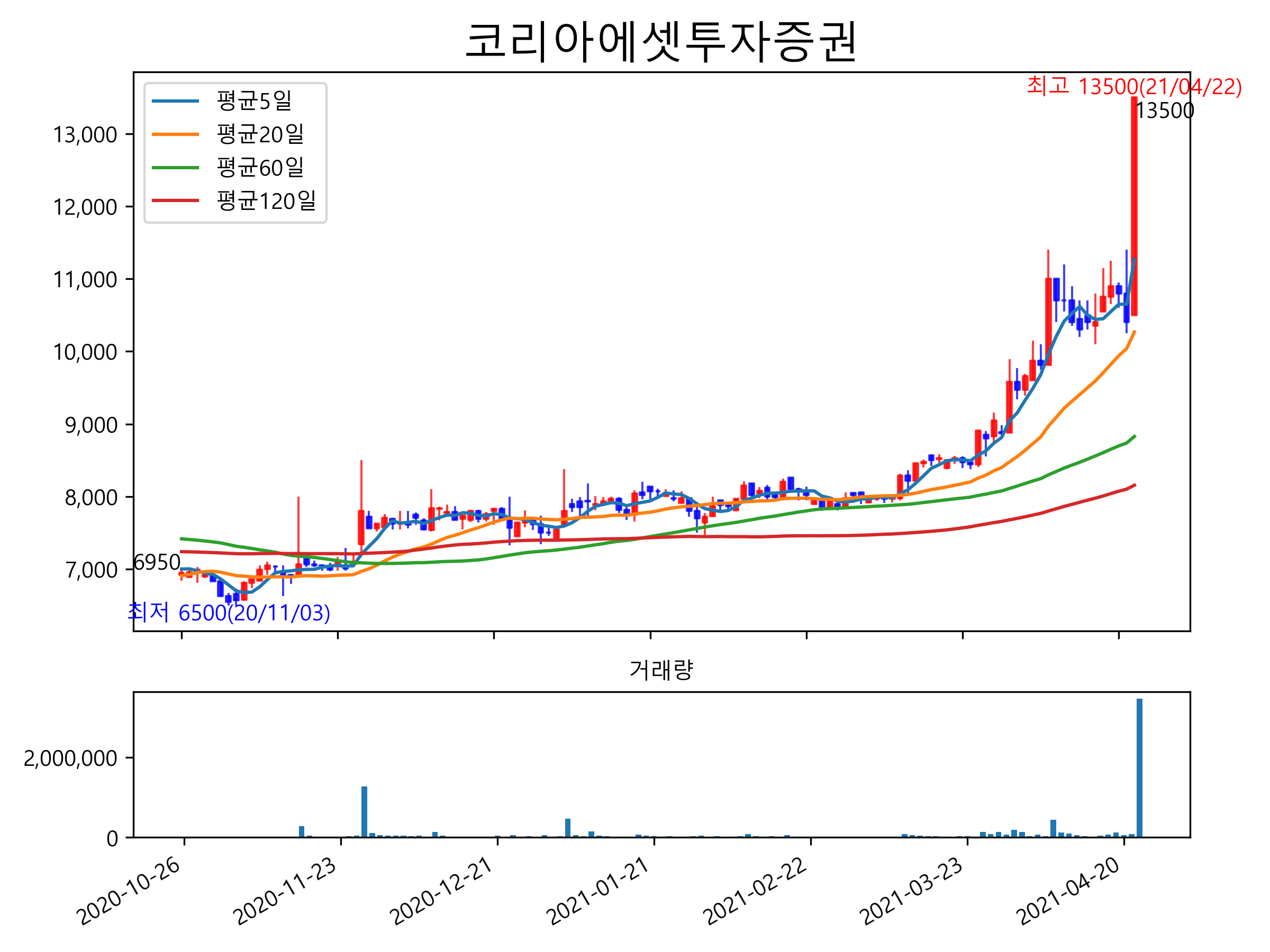 최근 6개월간 캔들차트 및 이동평균선입니다.