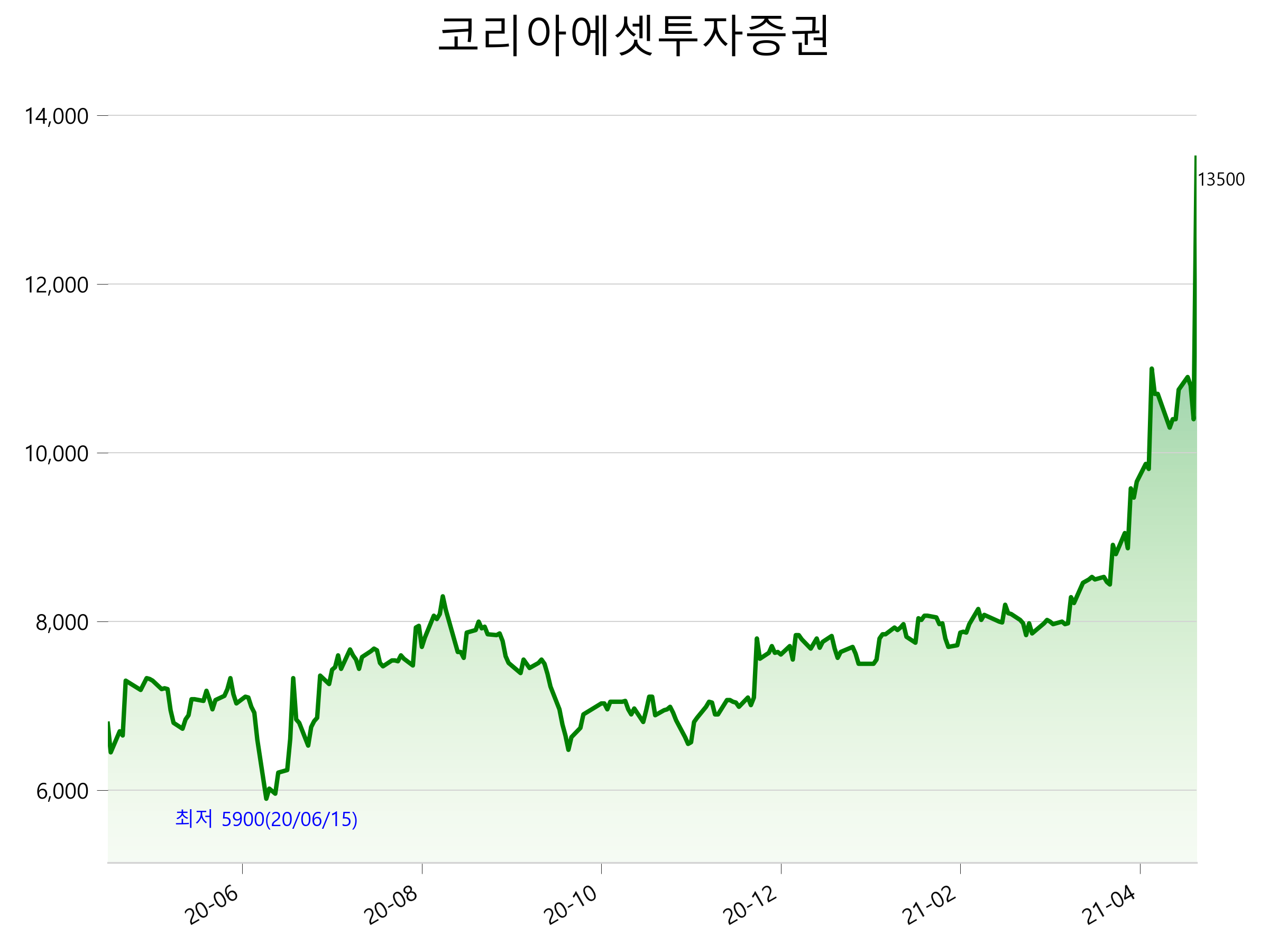 52주 최고가는 13,500원(2021-04-22), 52주 최저가는 5,900원(2020-06-15)으로 52주간 주가 상승률은 98.8% 입니다.