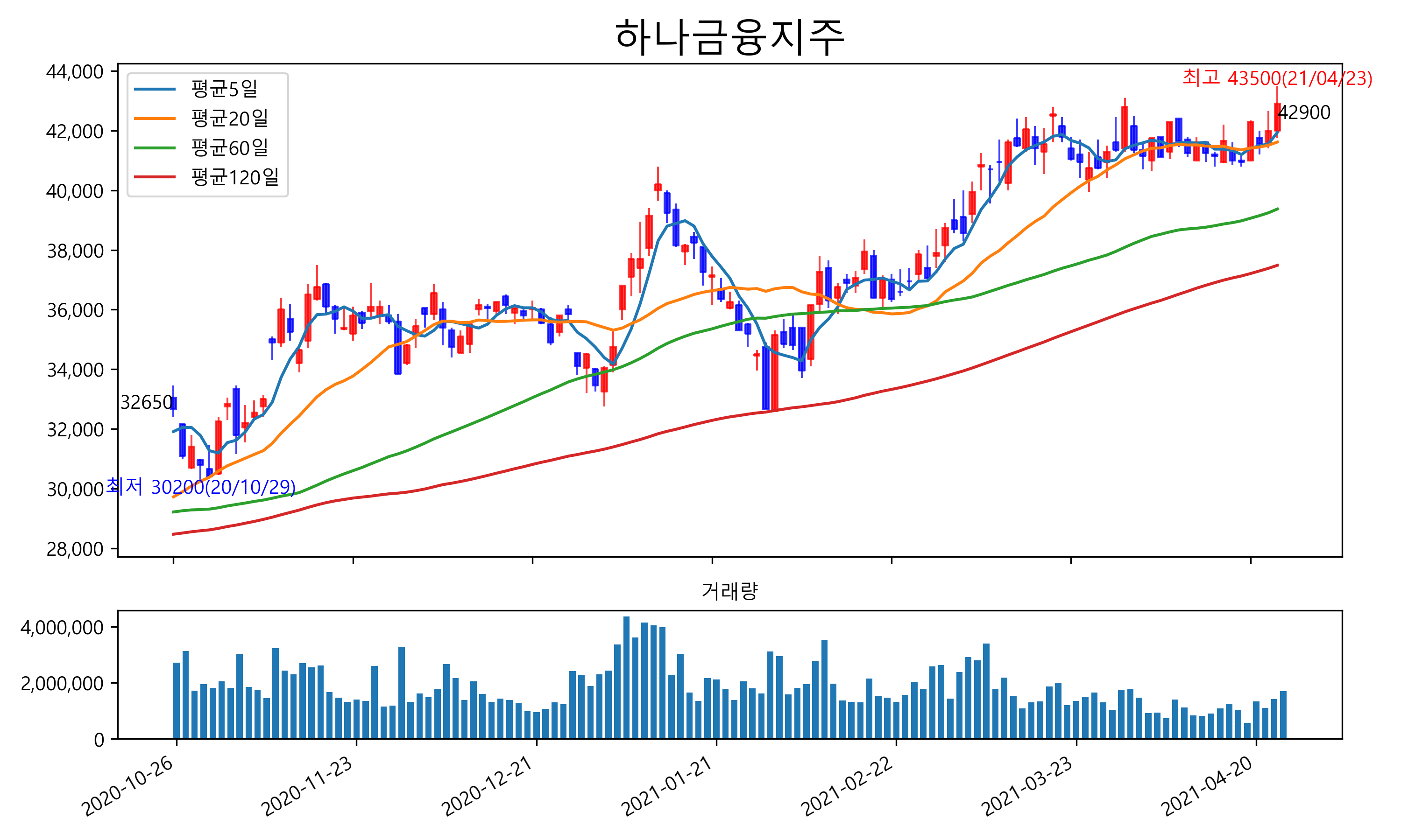 최근 6개월간 캔들차트 및 이동평균선입니다.