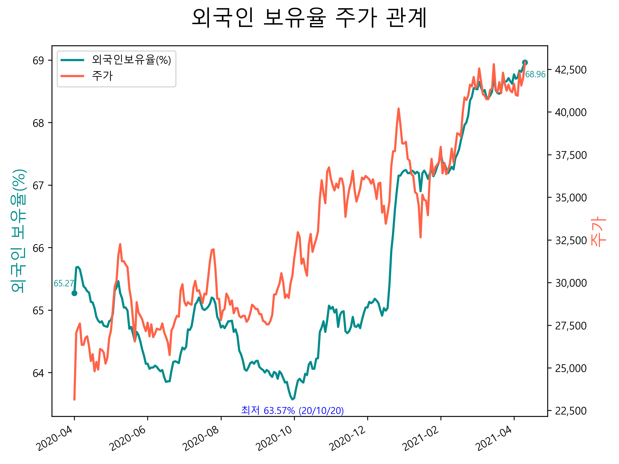 최근 1년간 외국인 보유율 및 주가와의 관계입니다.