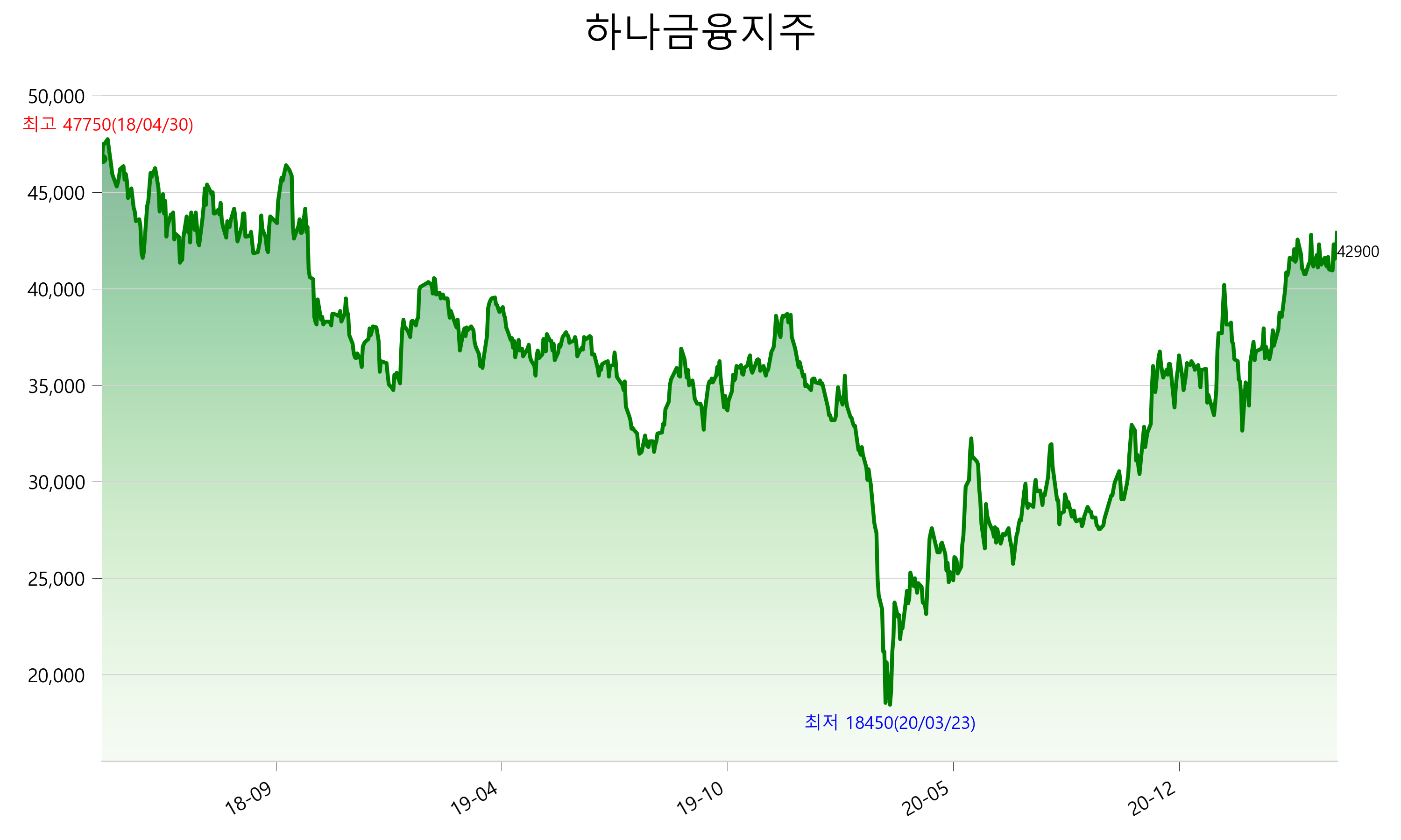 2021년 04월 23일 기준 주가는 42,900원 입니다. 아래는 최근 3년간의 주가흐름입니다.