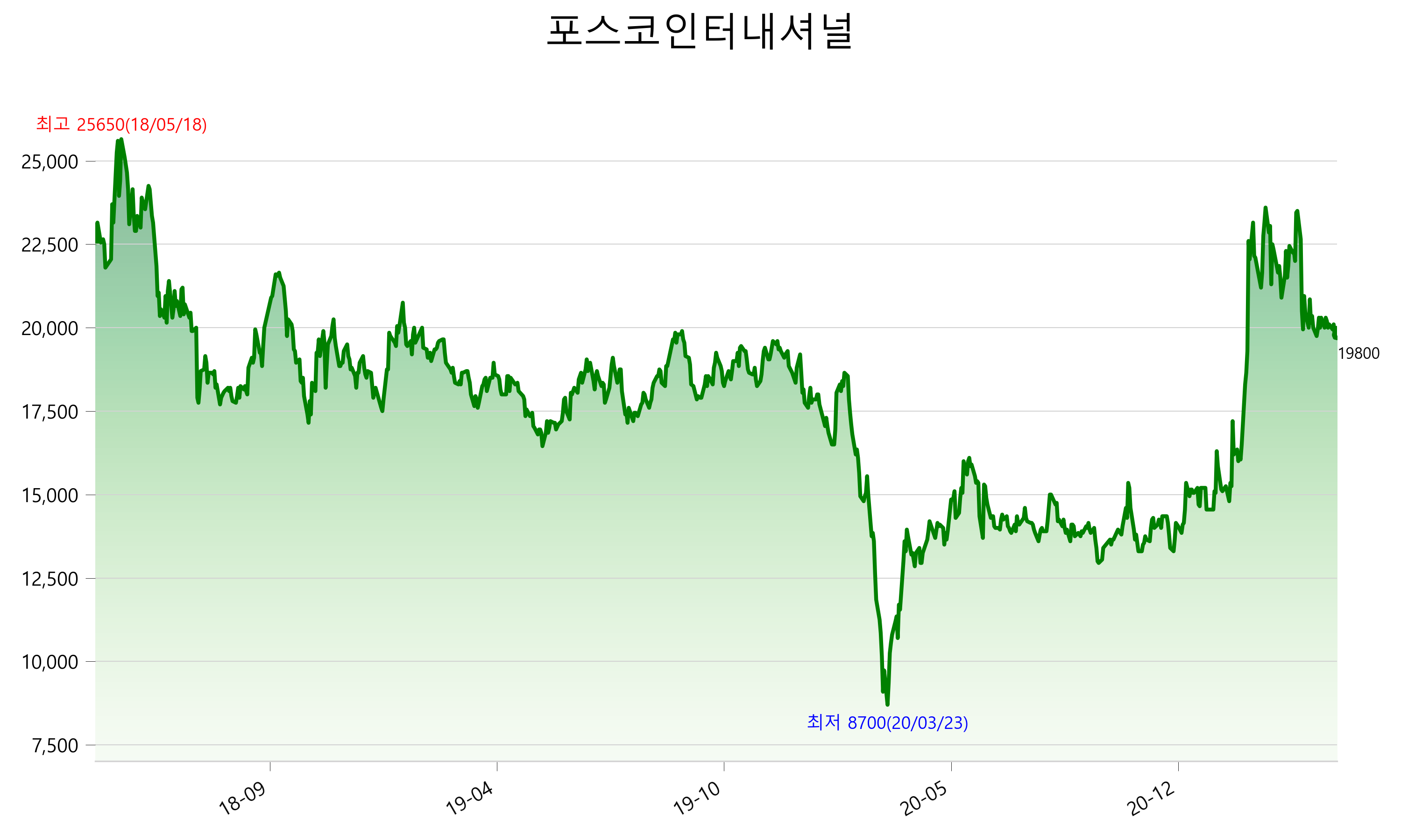 2021년 04월 23일 기준 주가는 19,800원 입니다. 아래는 최근 3년간의 주가흐름입니다.