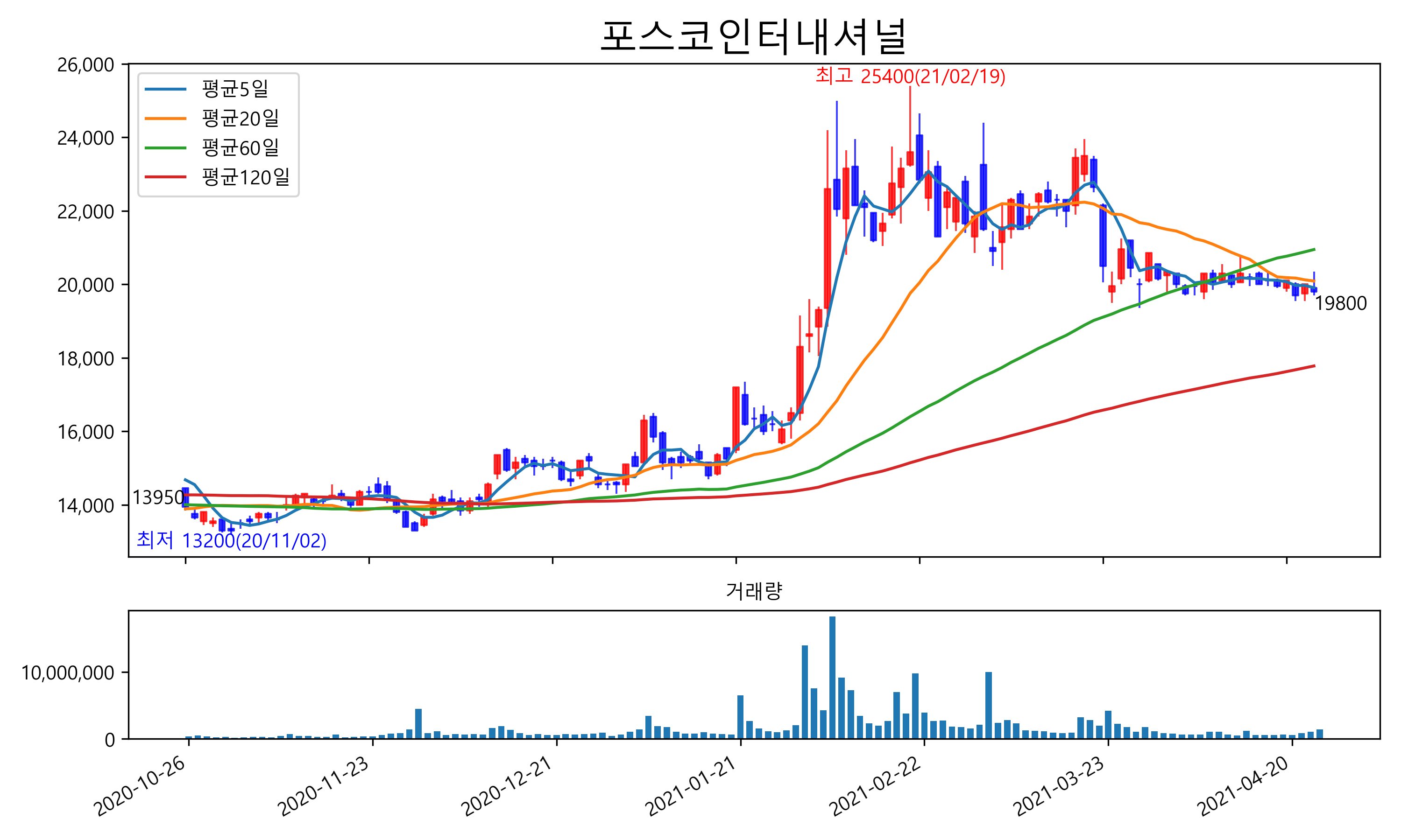 최근 6개월간 캔들차트 및 이동평균선입니다.