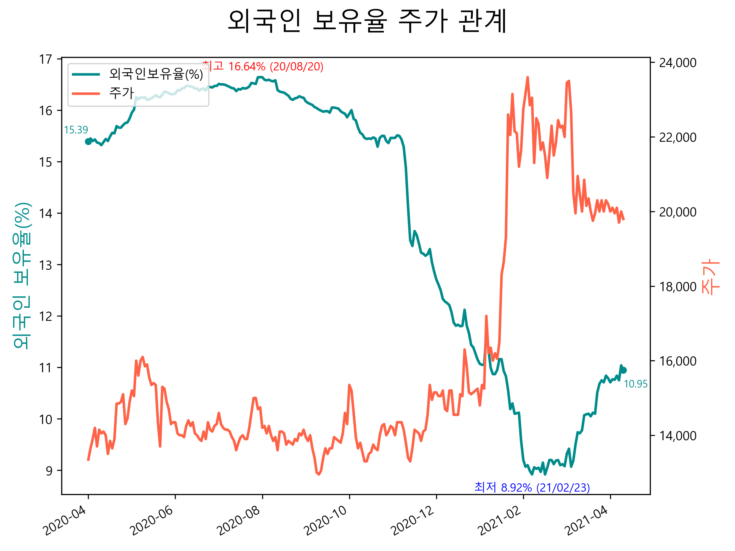 최근 1년간 외국인 보유율 및 주가와의 관계입니다.