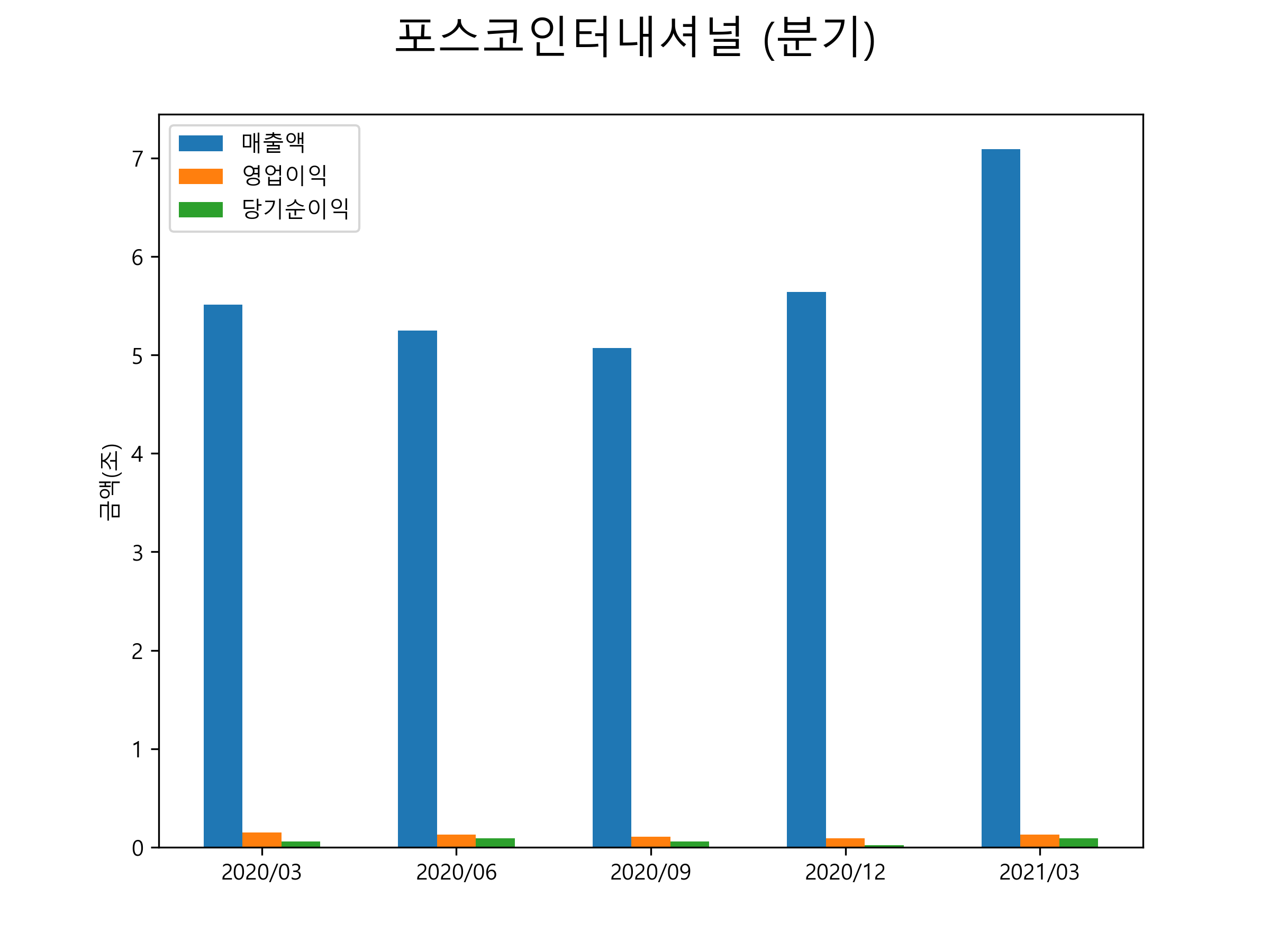 포스코인터내셔널의 2021년 1분기 매출은 7조 0870억원, 영업이익 1269억원, 당기순이익 929억원을 기록했습니다. 분기별 매출 및 영업이익, 당기순이익 표입니다.