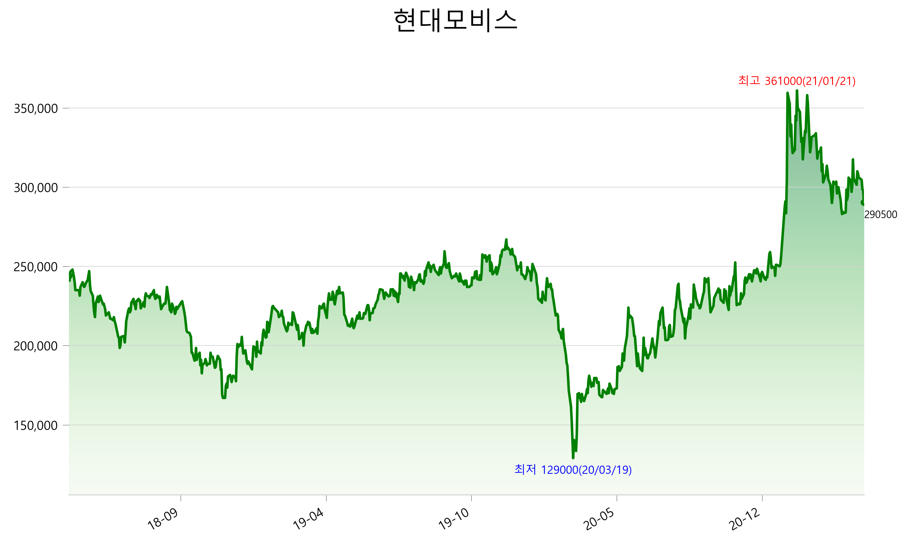 2021년 04월 23일 기준 주가는 290,500원 입니다. 아래는 최근 3년간의 주가흐름입니다.