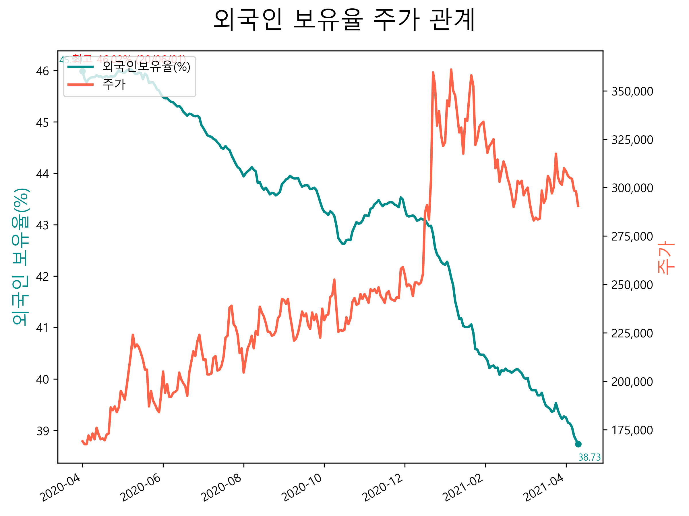 최근 1년간 외국인 보유율 및 주가와의 관계입니다.