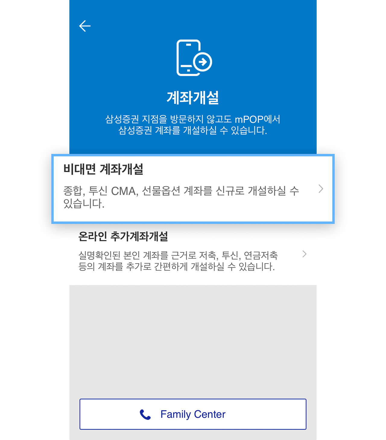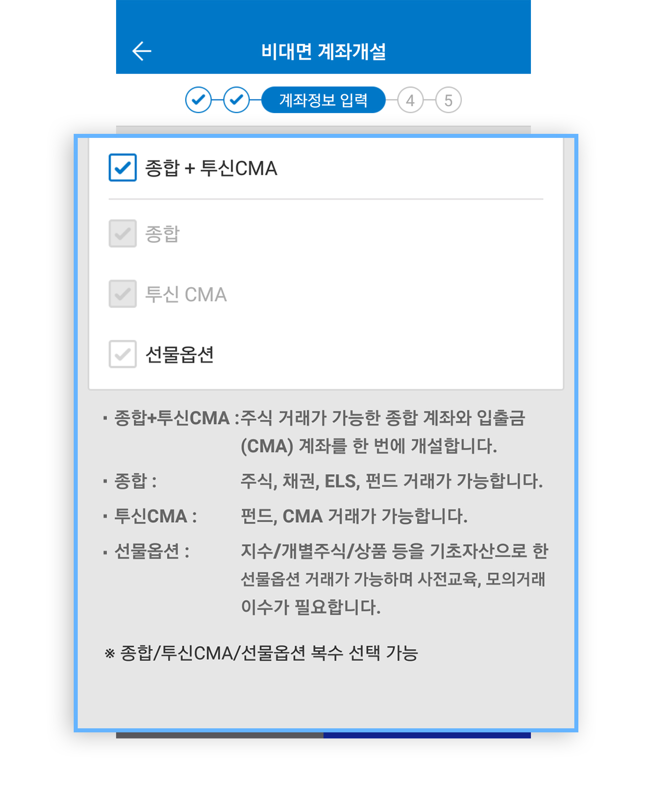 - 본인 휴대폰 인증 및 약관 승인 후 계좌 종류를 선택
