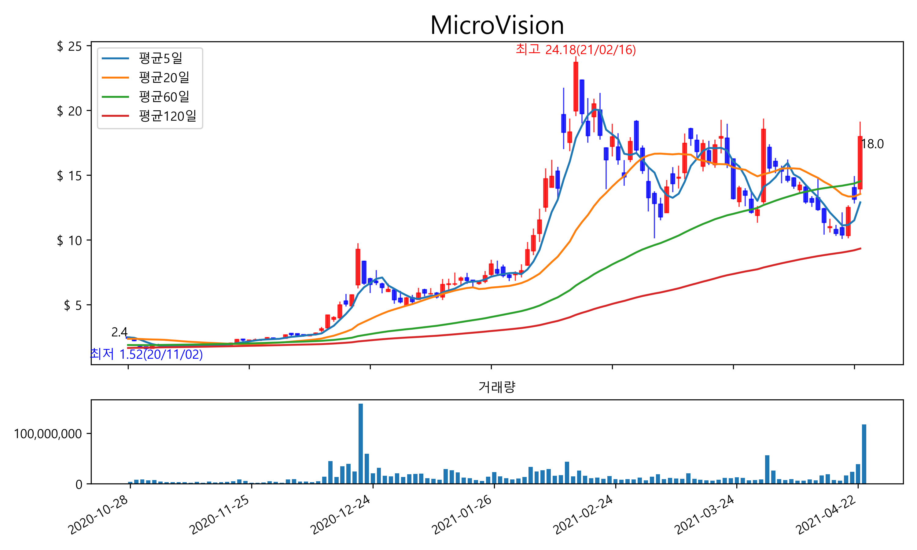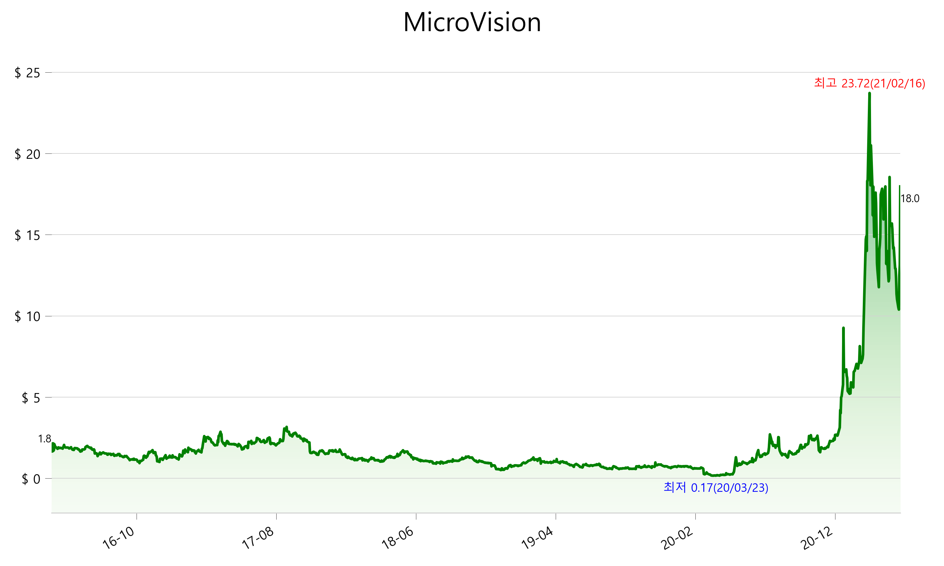 마이크로비전(MicroVision)은 마이크로소프트와 미 육군의 AR 헤드셋 공급 계약 소식이 전해지자 주가가 급등했습니다.