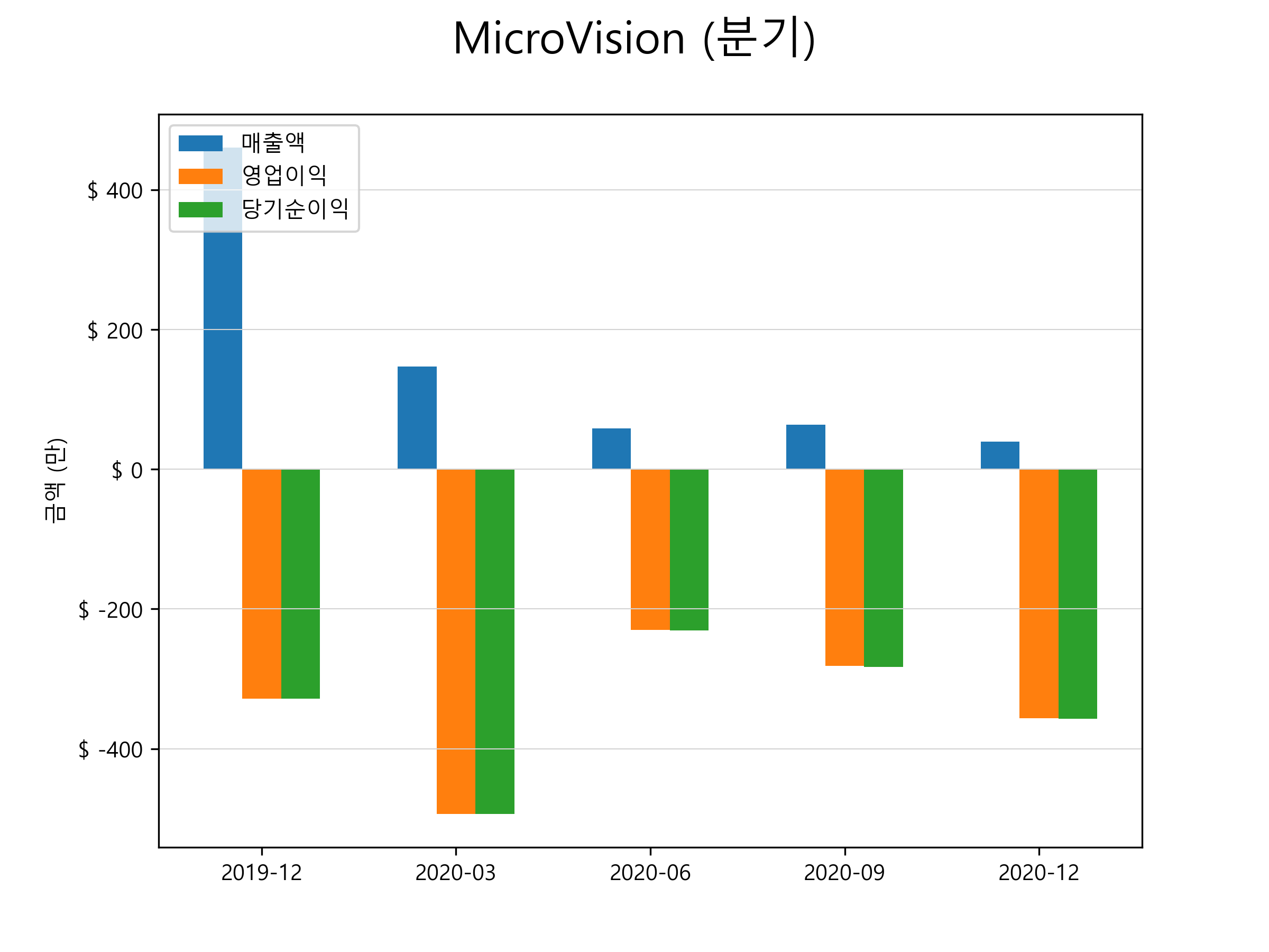 마이크로비전의 2020년 4분기 매출은 39.5만달러(약 4억 0923억원), 영업손실 -356.4만달러(약 39억원), 당기순손실 -357.0만달러(약 39억원)을 기록했습니다. 분기별 매출 및 영업이익, 당기순이익 표입니다.