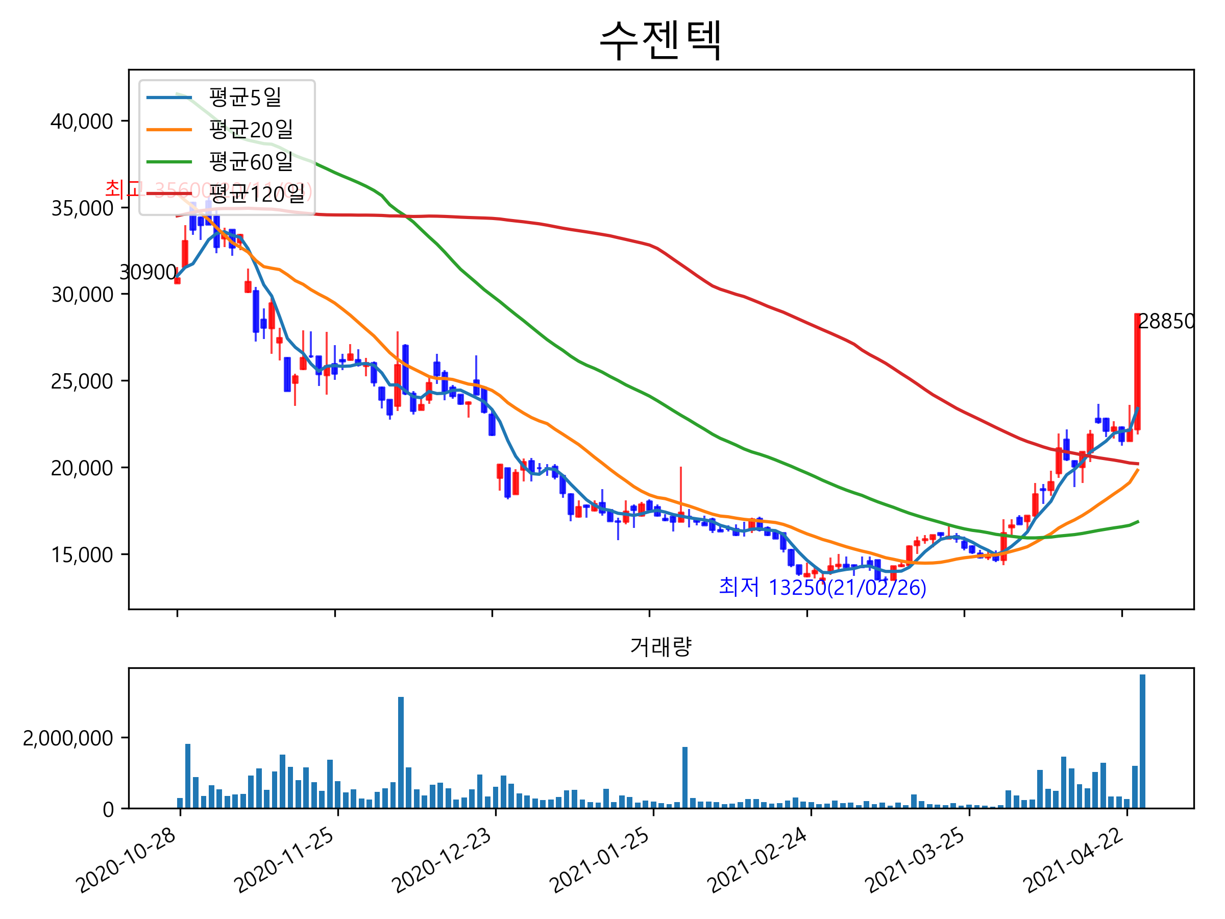 최근 6개월간 캔들차트 및 이동평균선입니다.