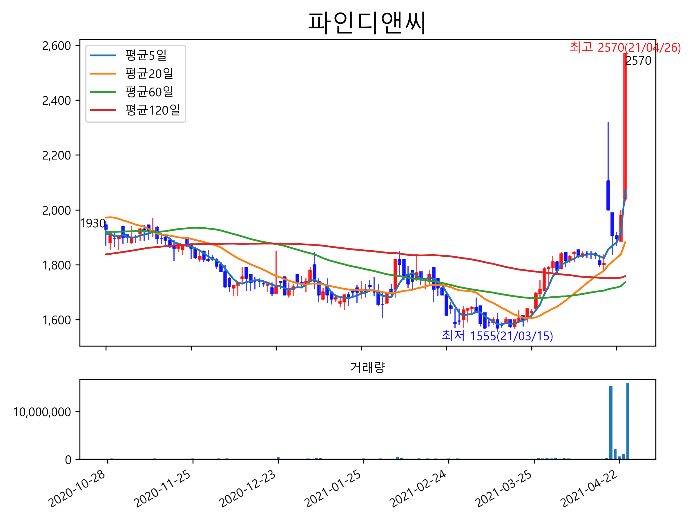 최근 6개월간 캔들차트 및 이동평균선입니다.
