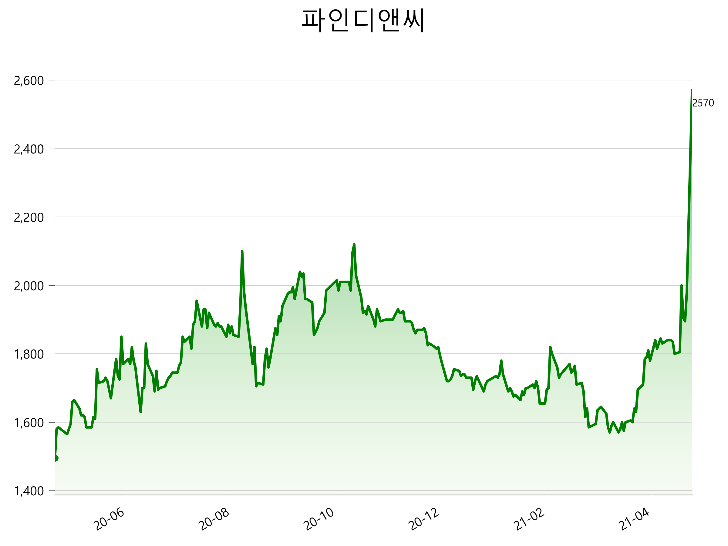 4월 26일 기준 주가는 2,570원 입니다. 아래는 최근 1년간의 주가흐름입니다.