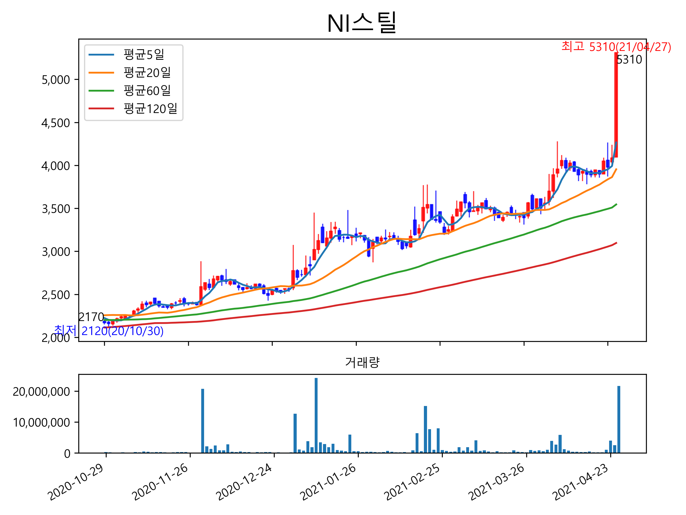 NI스틸은 21년 1분기 개별기준 영업이익이 60억7000만 원으로 전년동기대비 129.66% 증가했다고 공시하였습니다. NI스틸은 철강 중 저평가 종목이라는 인식 및 1분기 호실적의 영향으로 상한가를 기록한 것으로 보여집니다.