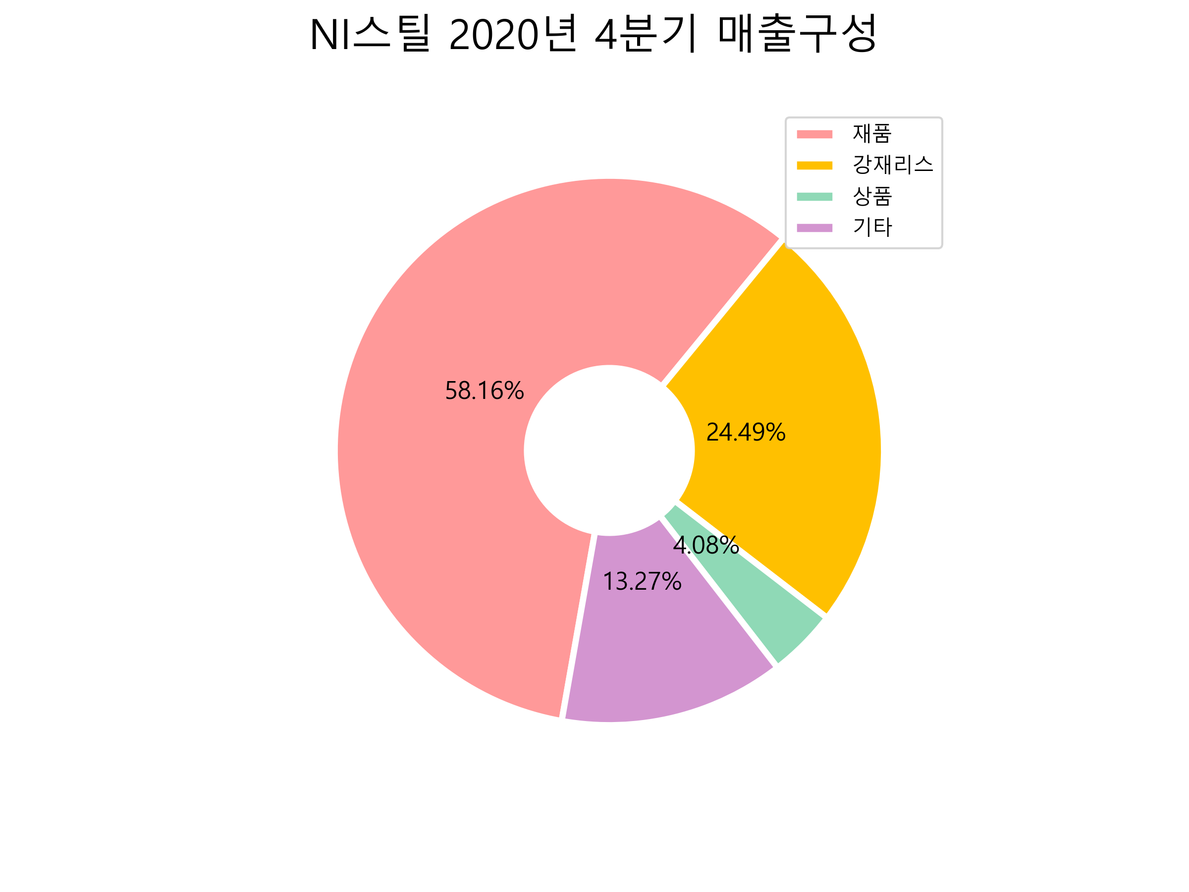 - 매출은 제품 57.03%, 강재리스 24.85%, 기타 13.33%, 상품 4.78% 등으로 이루어져 있음.