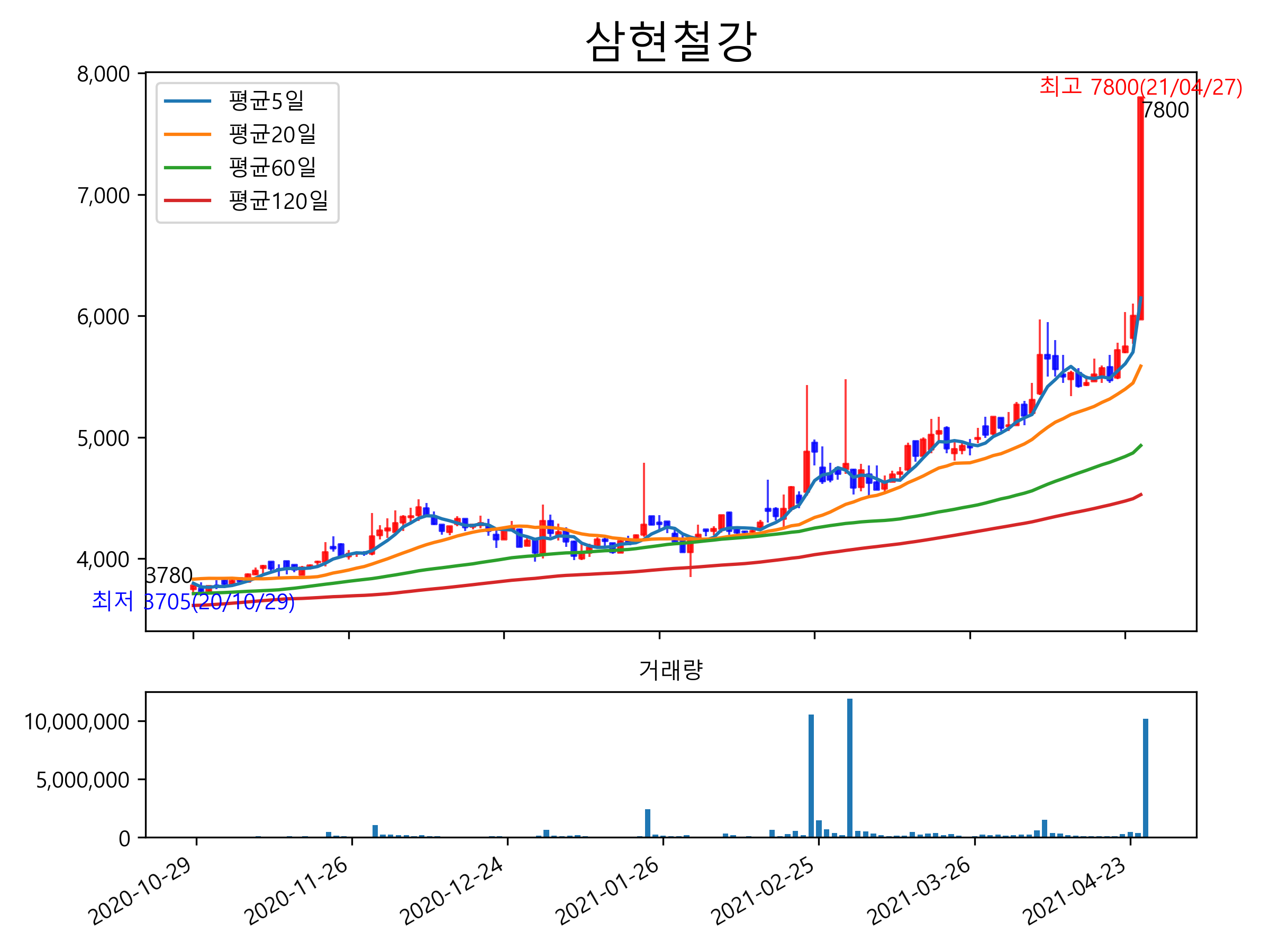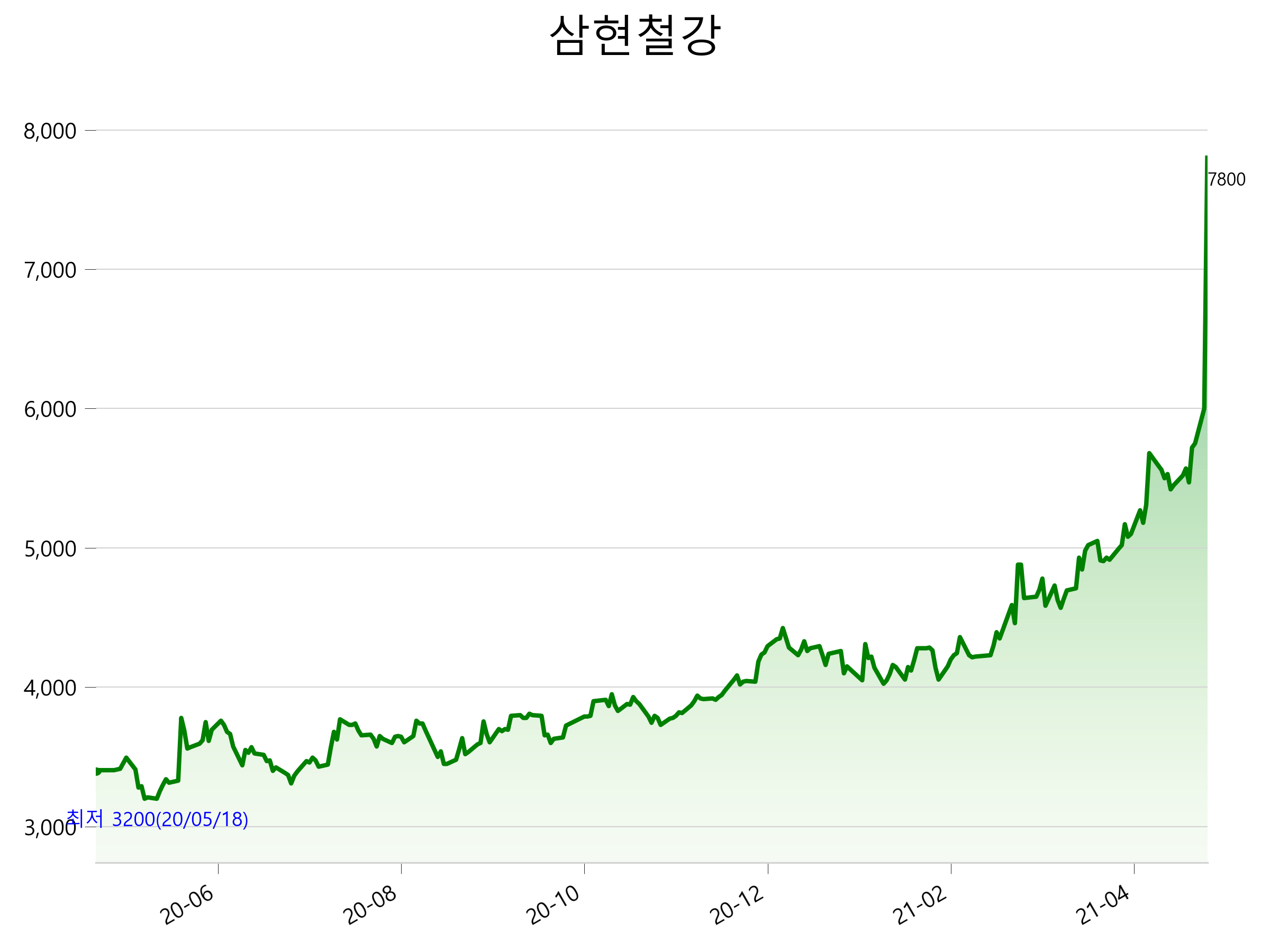 철강 업황 호조에 삼현철강 주가가 상한가를 기록한 것으로 보여집니다. 4월 20일 철광석 가격은 톤당 187.85달러를 기록하면서 지난 2011년 이후 최고치를 기록하였으며, 중국의 철강 감산정책과 글로벌 경기회복에 따른 철강수요가 맞물려 철강업계는 호황 국면에 진입하였습니다.