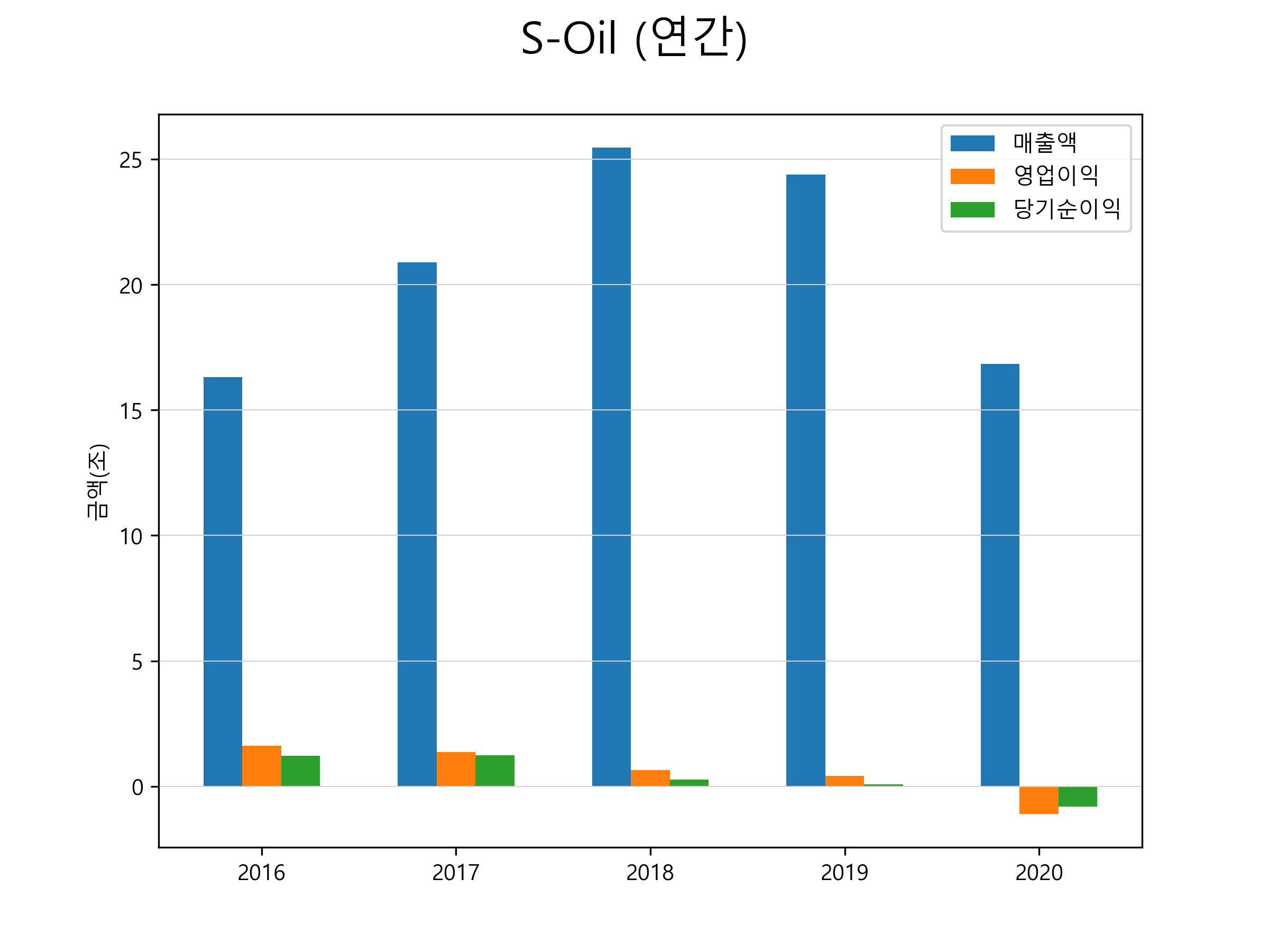 S-Oil의 최근 5년간 실적입니다. 2020년 매출은 16조 8297억원, 영업손실 10991억원, 당기순손실 -7961억원을 기록했습니다. 연간 매출 및 영업이익, 당기순이익 표입니다.