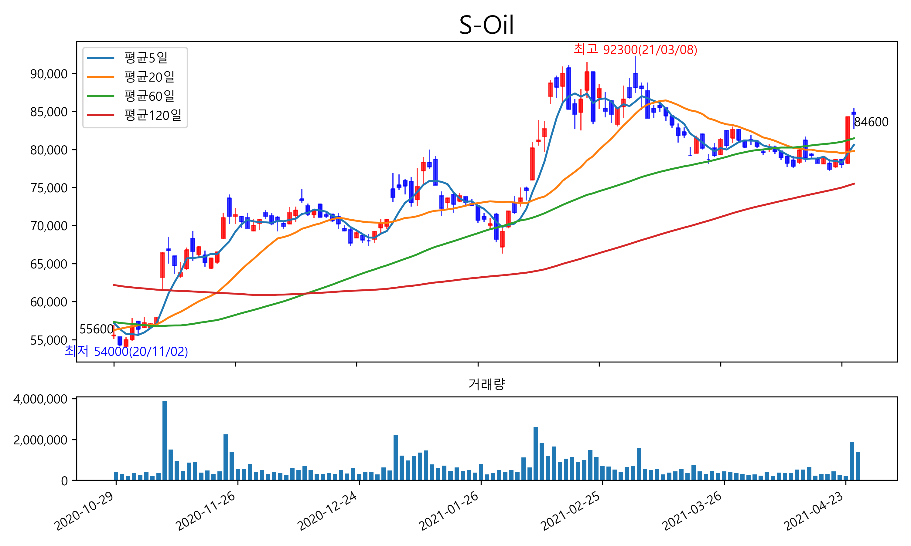최근 6개월간 캔들차트 및 이동평균선입니다.