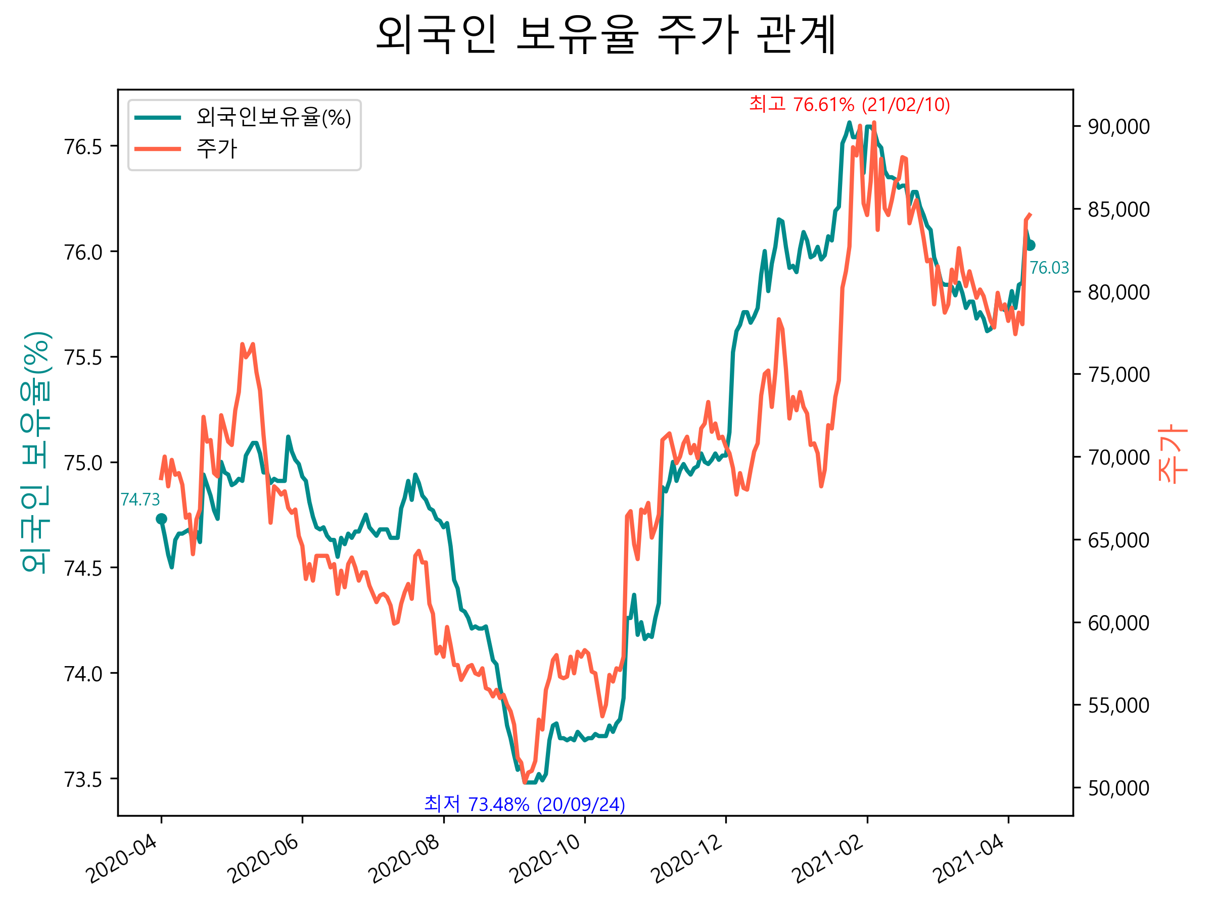 최근 1년간 외국인 보유율 및 주가와의 관계입니다.
