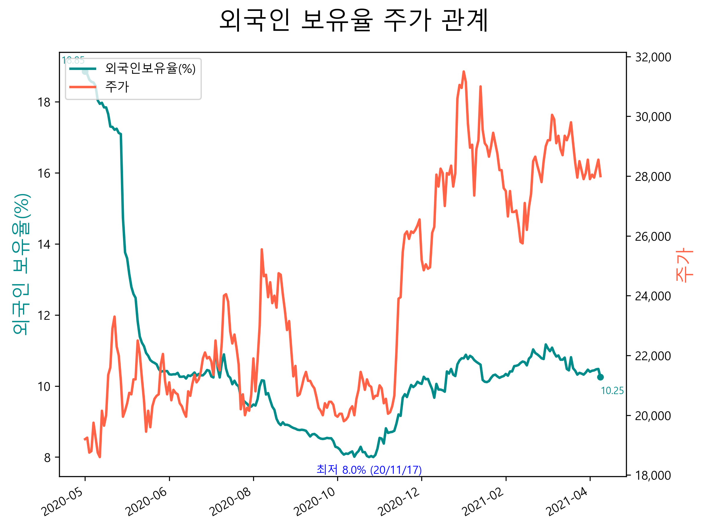 최근 1년간 외국인 보유율 및 주가와의 관계입니다.