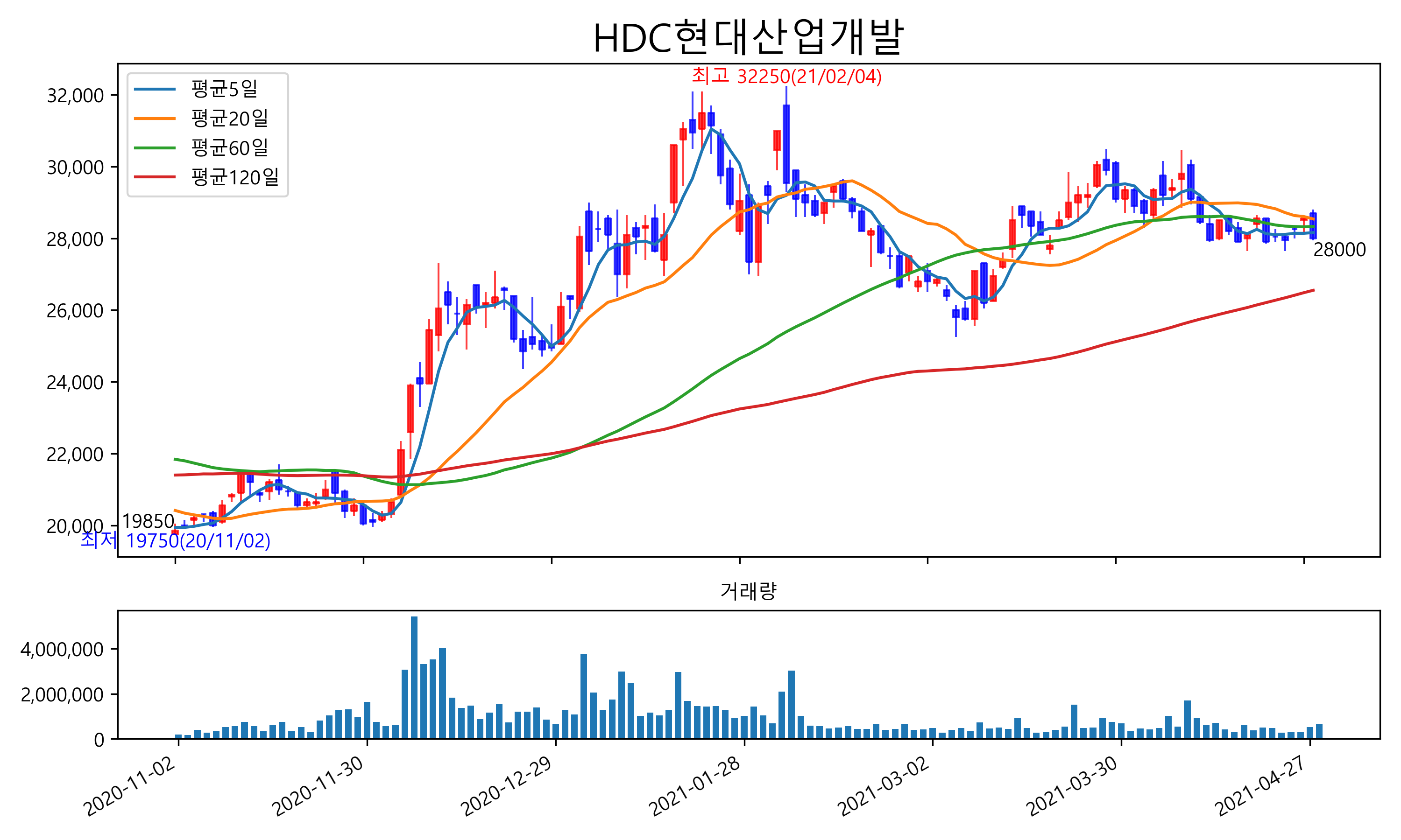 최근 6개월간 캔들차트 및 이동평균선입니다.