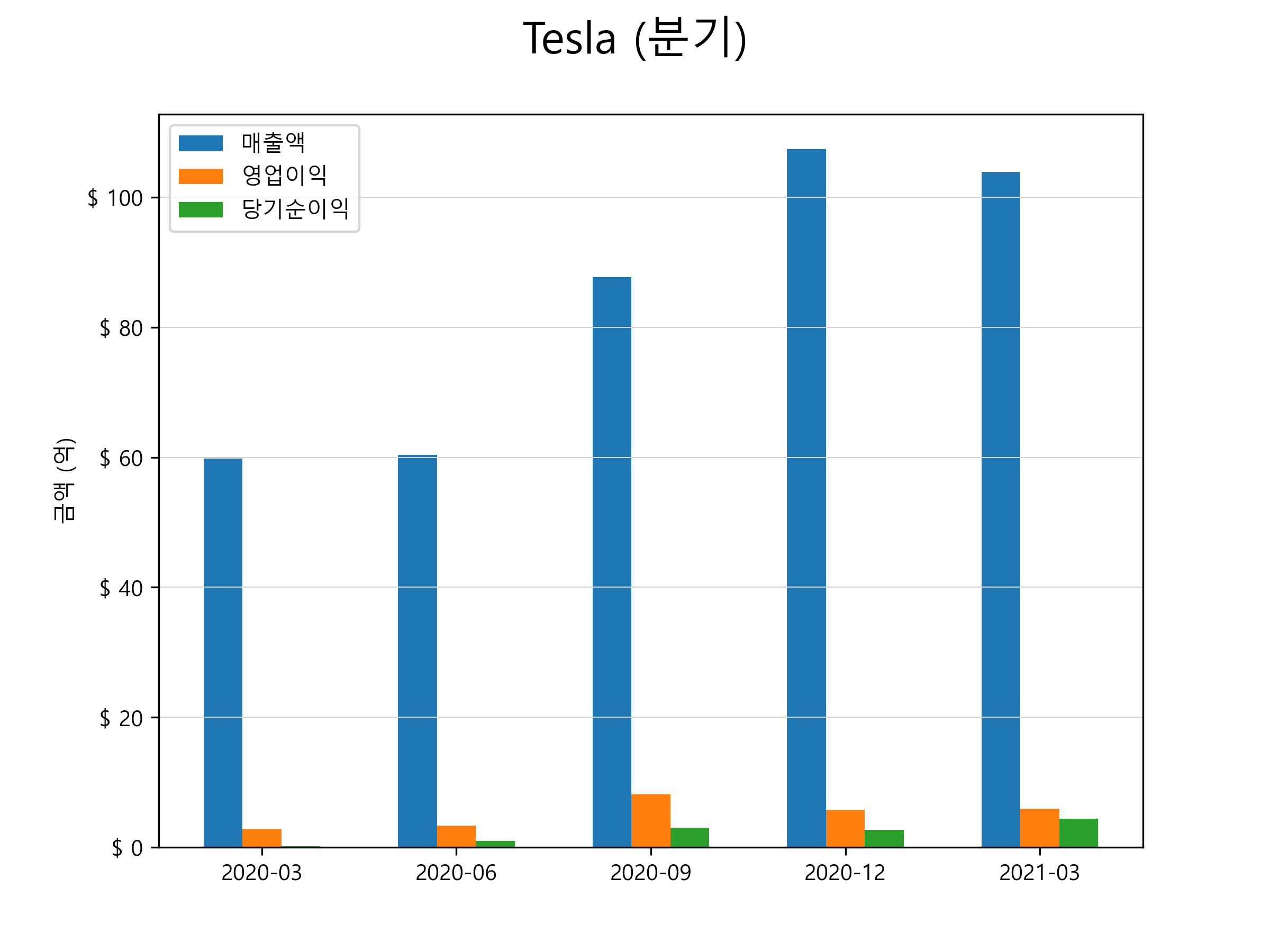 테슬라의 2021년 1분기 매출은 103.9억달러(약 11조 5173억원), 영업이익 5.9억달러(약 6540억원), 당기순이익 4.4억달러(약 4877억원)을 기록했습니다. 분기별 매출 및 영업이익, 당기순이익 표입니다.