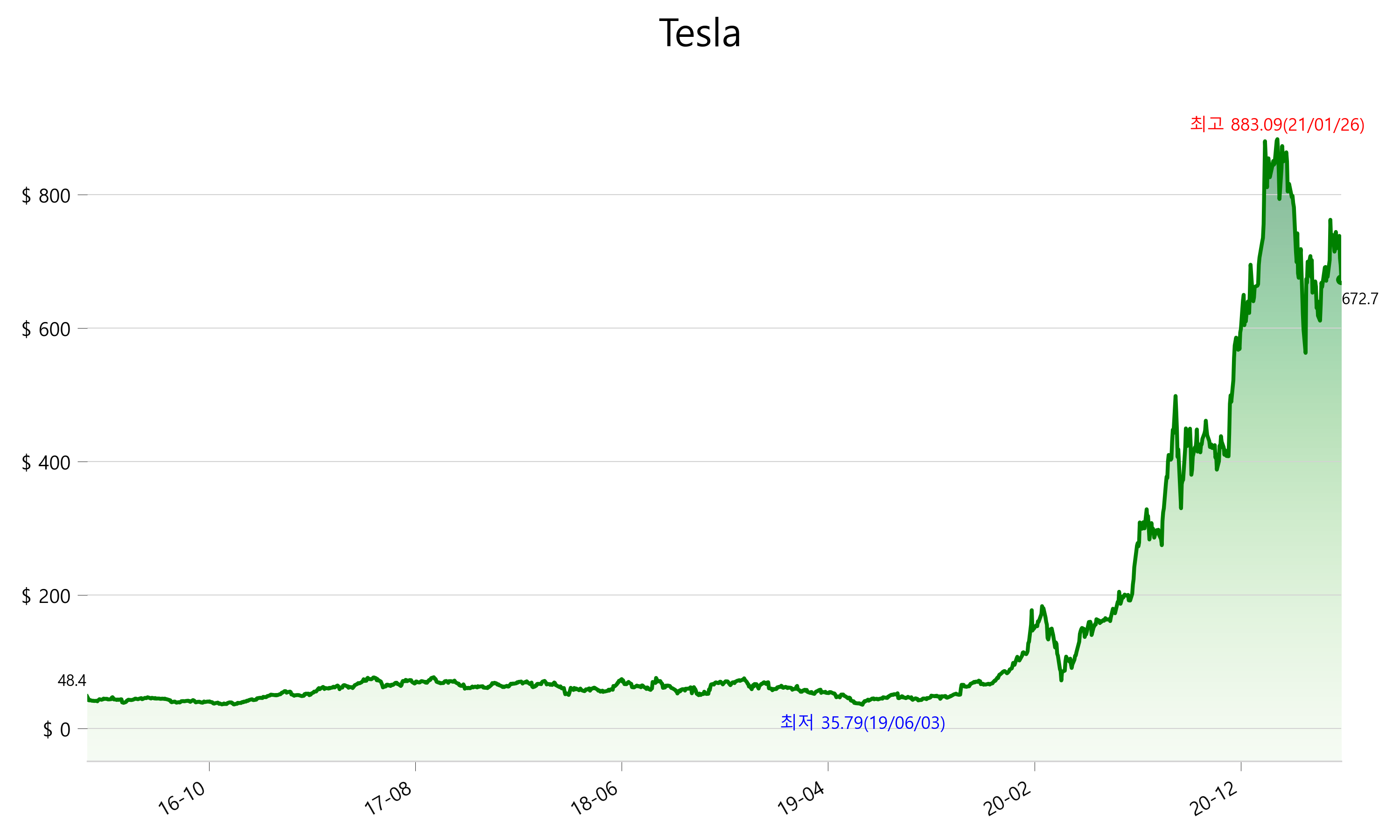 4월 30일 기준 주가는 672.7달러 입니다. 5년전과 비교해서 1291.0% 상승했습니다.