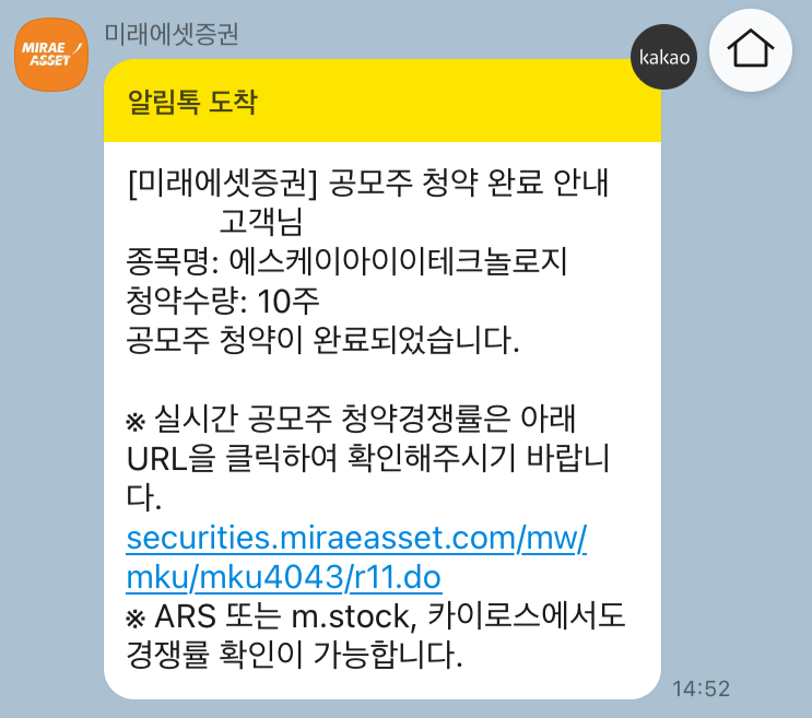 클릭만 하면 청약은 끝납니다. 굉장히 간단합니다. 청약이 완료되면 카카오톡 메세지 등으로 알림이 오기도 합니다.