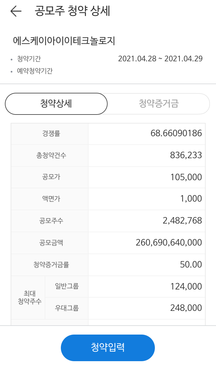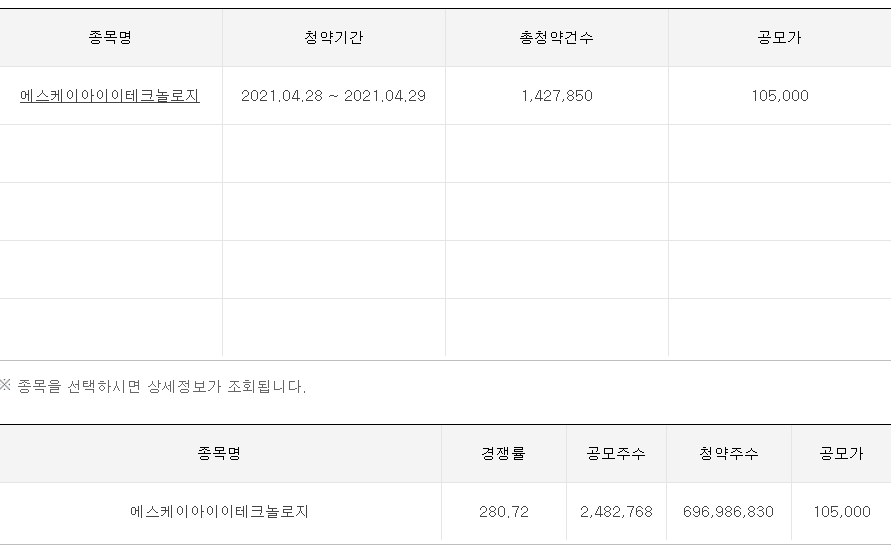 예를 들어서 설명해드리겠습니다. 아래는 미래에셋증권의 SKIET 청약경쟁률입니다.