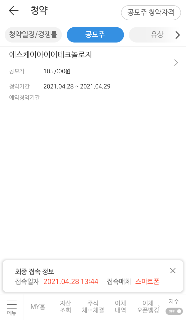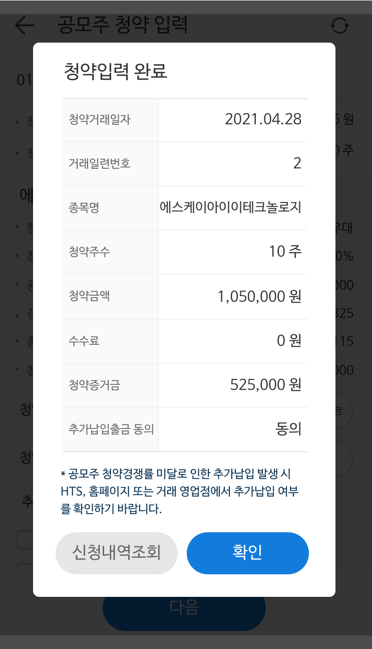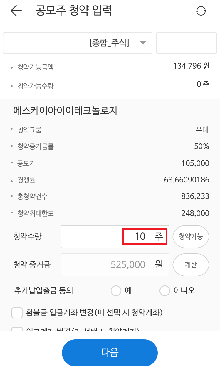청약 증거금에 해당하는 금액을 증권사 주식계좌 등에 입금을 해놓아야 합니다. 청약증거금은 공모가의 50%로 SKIET 10주를 청약하는 경우 주당 105,000원 x 10주 x 50% = 525,000원 을 계좌에 입금해놓습니다. 한국투자증권이나 SK증권 등 일부 증권사는 청약수수료 2000원을 받게 되니 이 금액도 포함해서 넣어놓습니다.