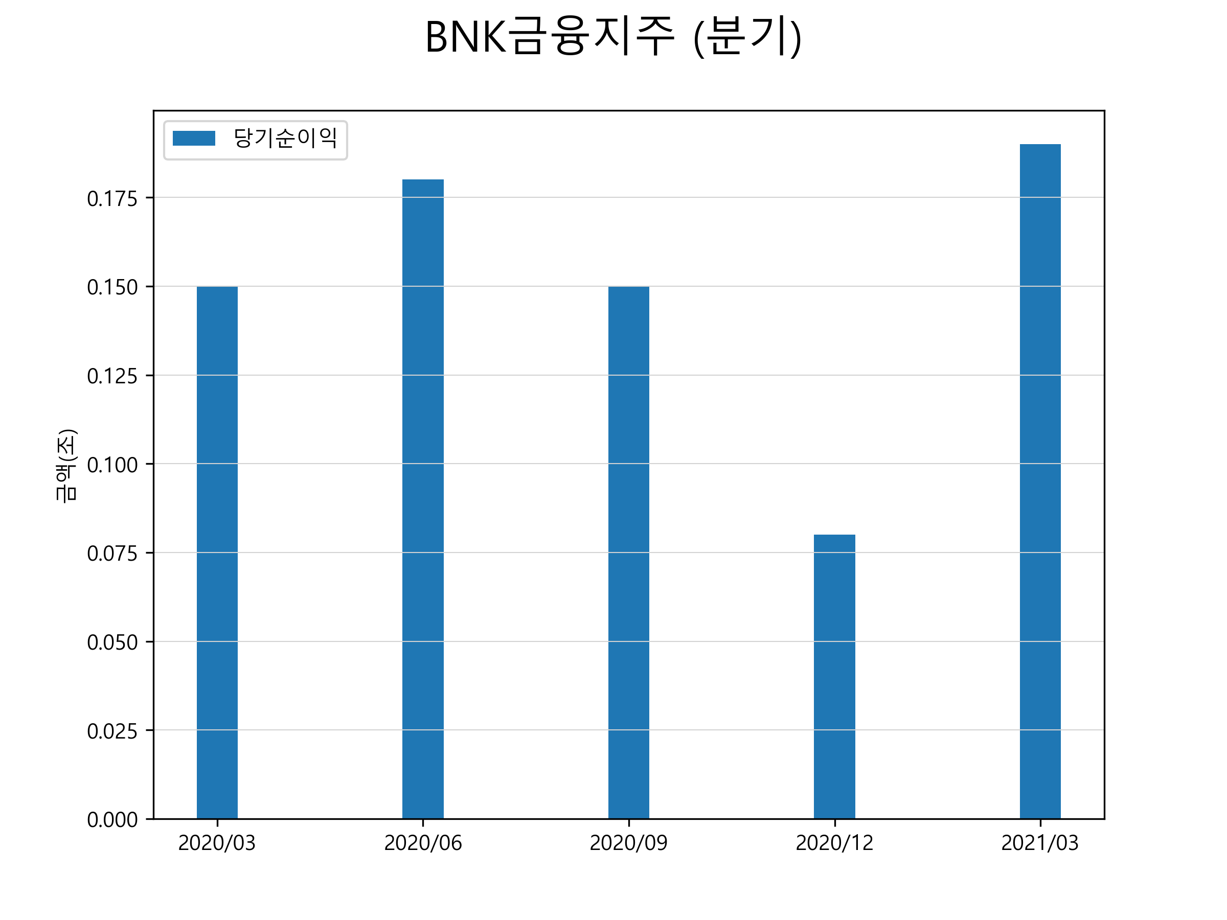 BNK금융지주의 2021년 1분기 당기순이익은 1927억원을 기록했습니다. 분기별 당기순이익 표입니다.