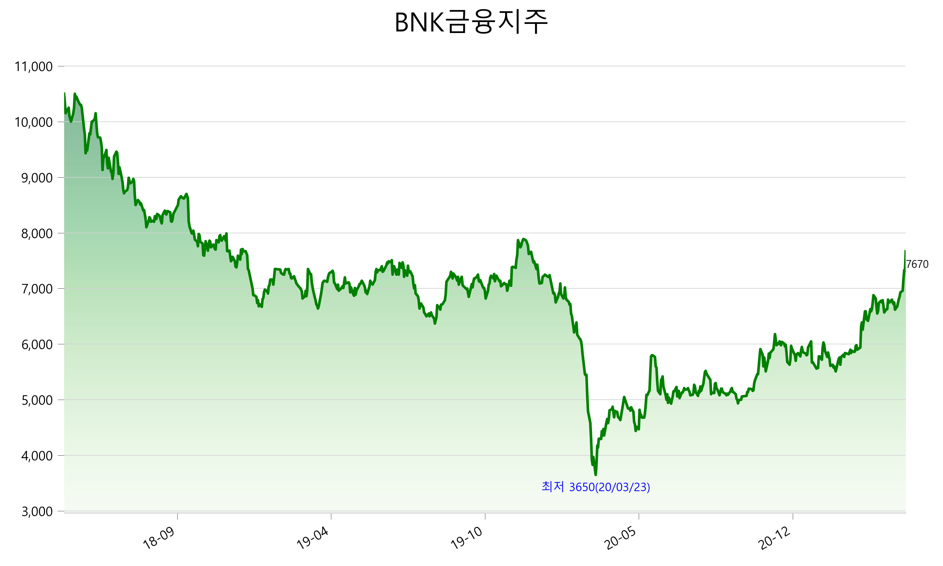 2021년 04월 30일 기준 주가는 7,670원 입니다. 아래는 최근 3년간의 주가흐름입니다.