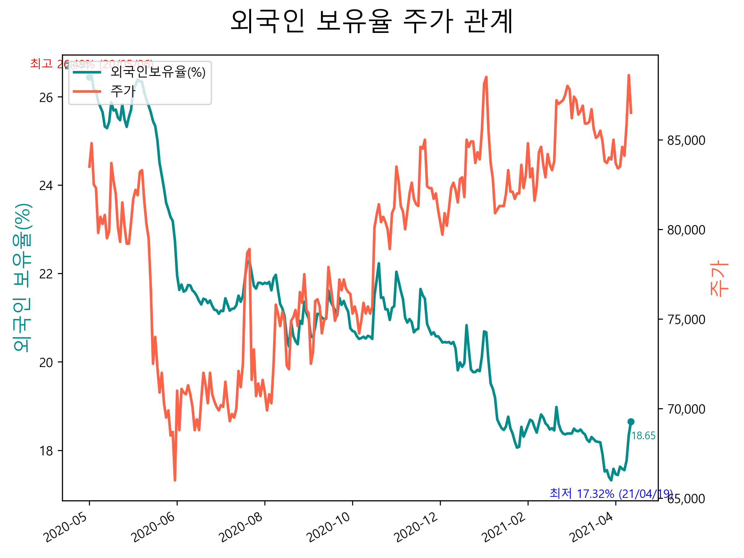 최근 1년간 외국인 보유율 및 주가와의 관계입니다.