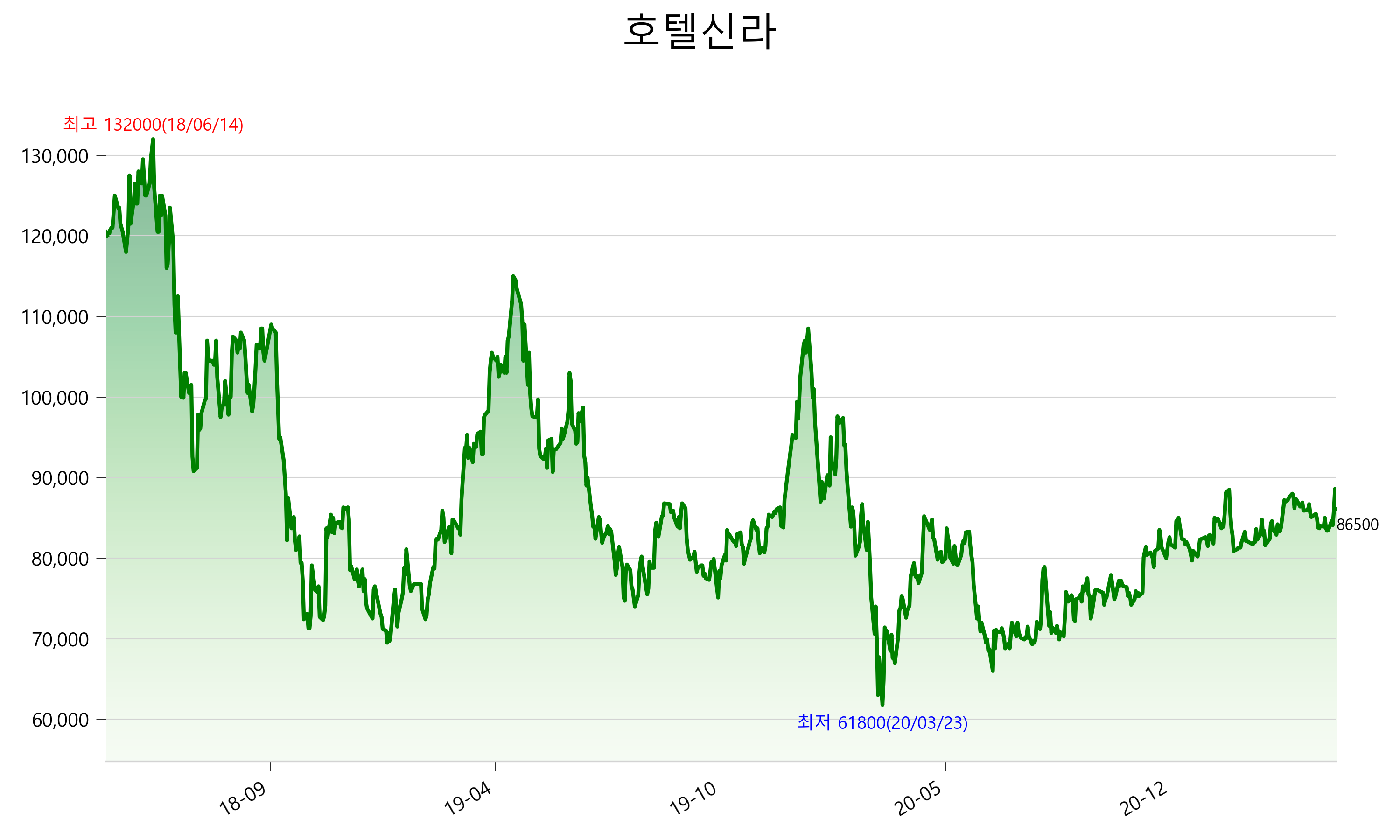 2021년 05월 01일 기준 주가는 86,500원 입니다. 아래는 최근 3년간의 주가흐름입니다.