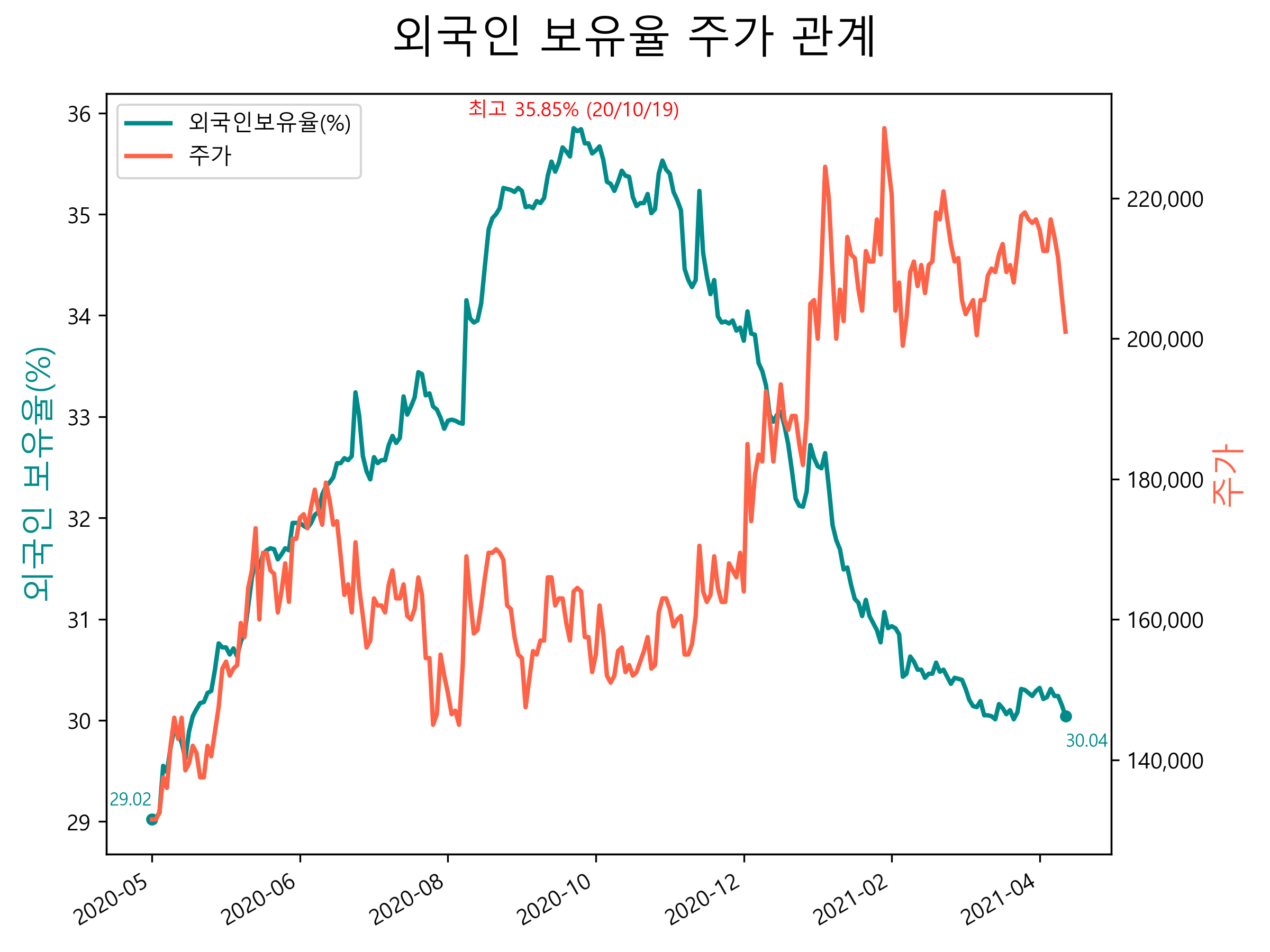 최근 1년간 외국인 보유율 및 주가와의 관계입니다.