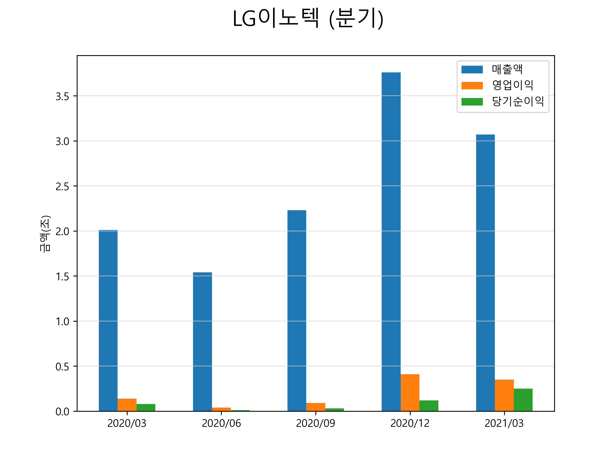 LG이노텍의 2021년 1분기 매출은 3조 703억원, 영업이익 3468억원, 당기순이익 2514억원을 기록했습니다. 분기별 매출 및 영업이익, 당기순이익 표입니다.