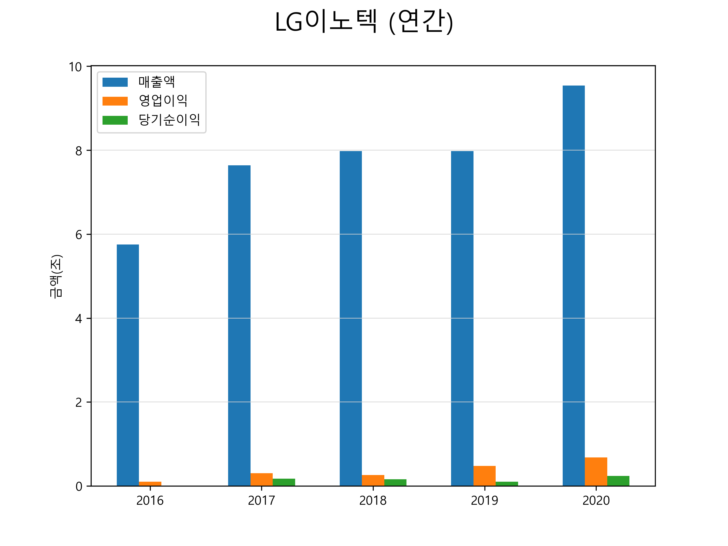LG이노텍의 최근 5년간 실적입니다. 2020년 매출은 9조 5418억원, 영업이익 6810억원, 당기순이익 2361억원을 기록했습니다. 연간 매출 및 영업이익, 당기순이익 표입니다.