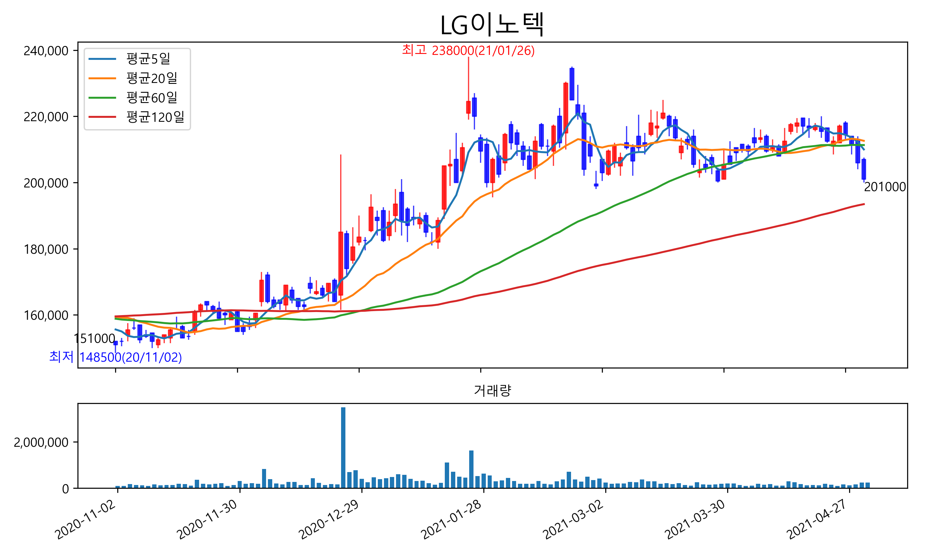 최근 6개월간 캔들차트 및 이동평균선입니다.