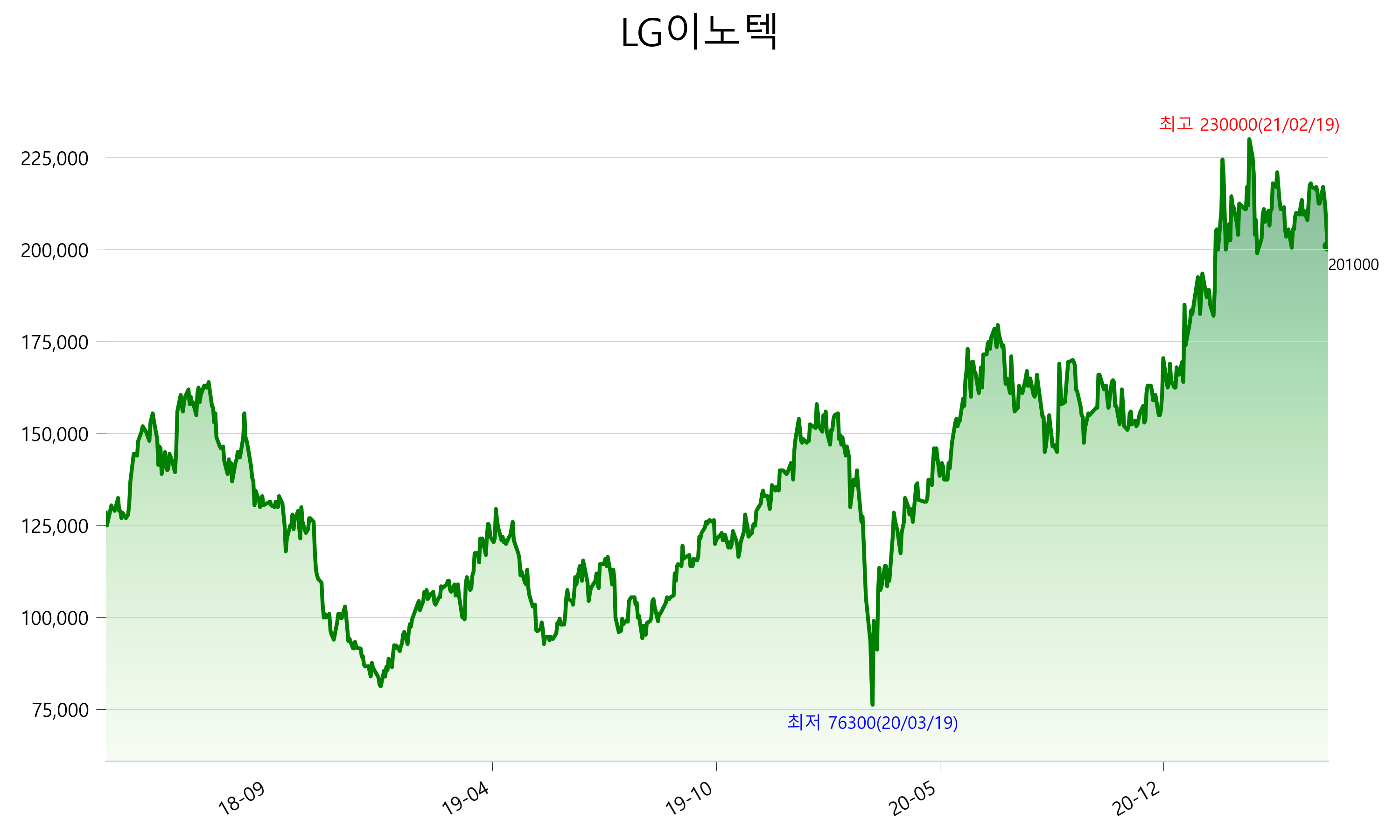 2021년 05월 01일 기준 주가는 201,000원 입니다. 아래는 최근 3년간의 주가흐름입니다.