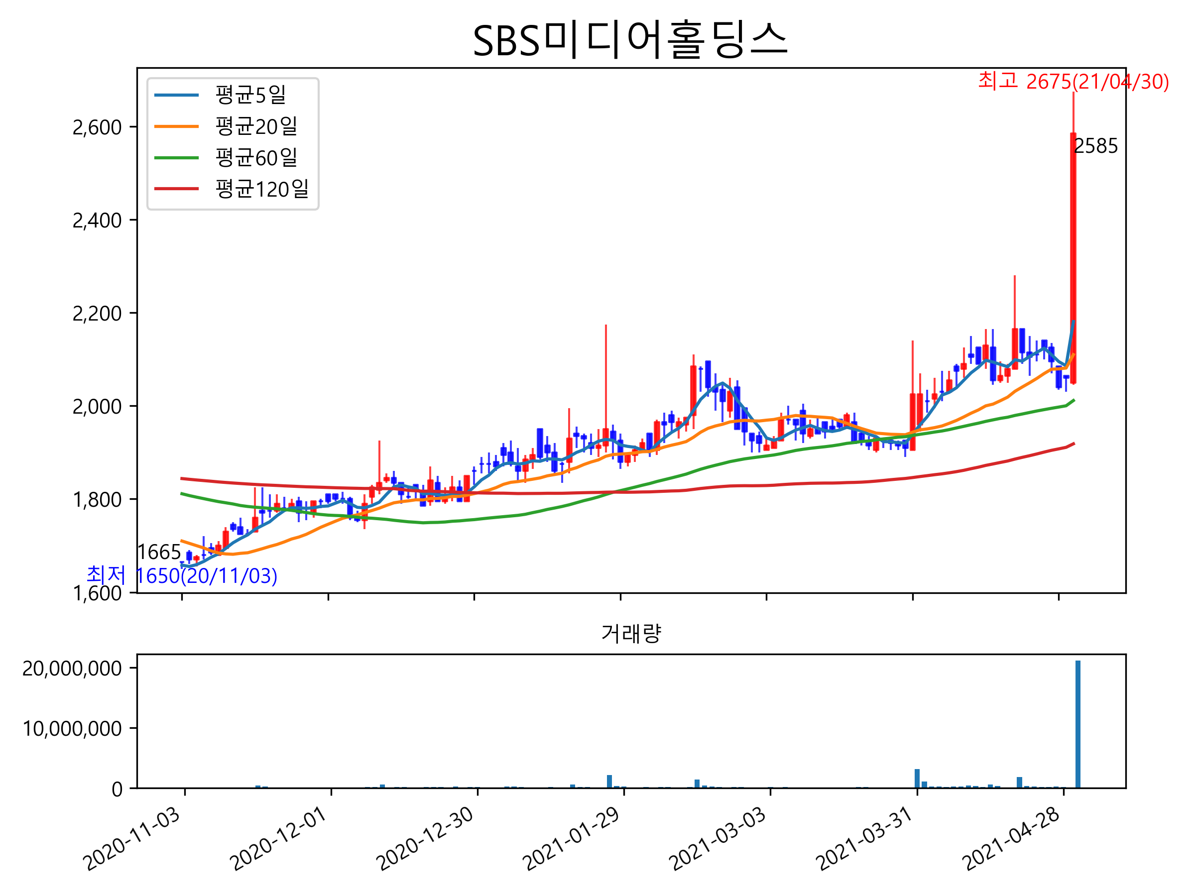 최근 6개월간 캔들차트 및 이동평균선입니다.