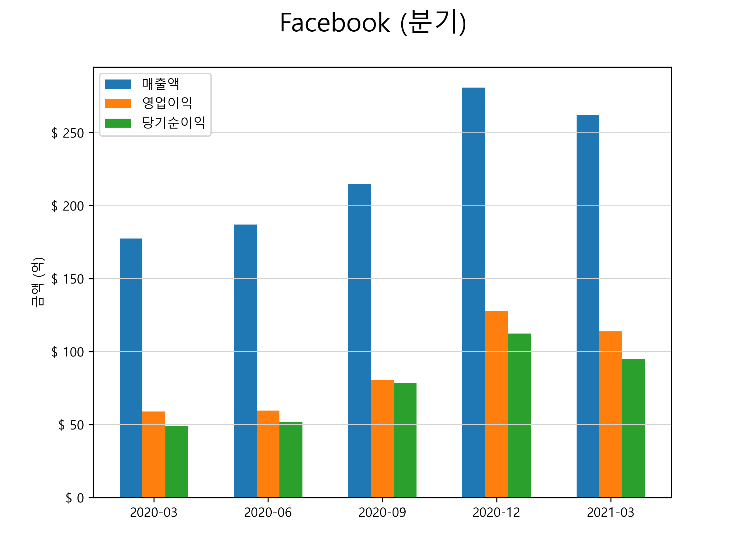 페이스북의 2021년 1분기 매출은 261.7억달러(약 29조 2450억원), 영업이익 113.8억달러(약 12조 7172억원), 당기순이익 95.0억달러(약 10조 6162억원)을 기록했습니다. 분기별 매출 및 영업이익, 당기순이익 표입니다.